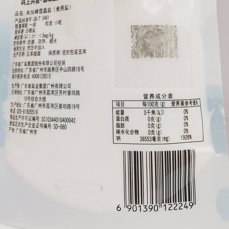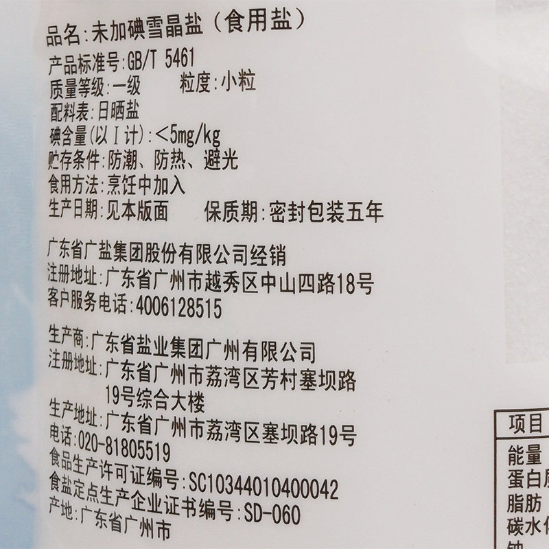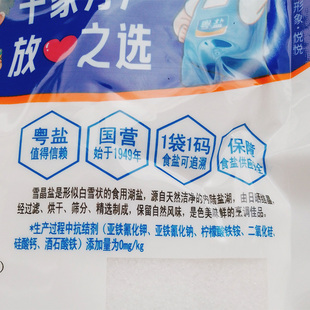 粤盐雪晶盐250g 5袋无碘食用盐家用盐无添加抗结剂不含碘盐巴湖盐