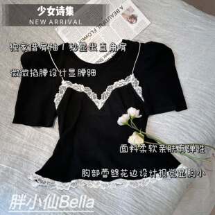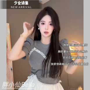 显瘦大码 微胖休闲夏季 少女诗集温柔透气短袖 蕾丝边T恤 胖小仙