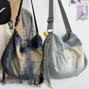 韩版 百搭随性通勤单肩斜挎包 复古做旧慵懒甜酷水洗牛仔包小众时尚