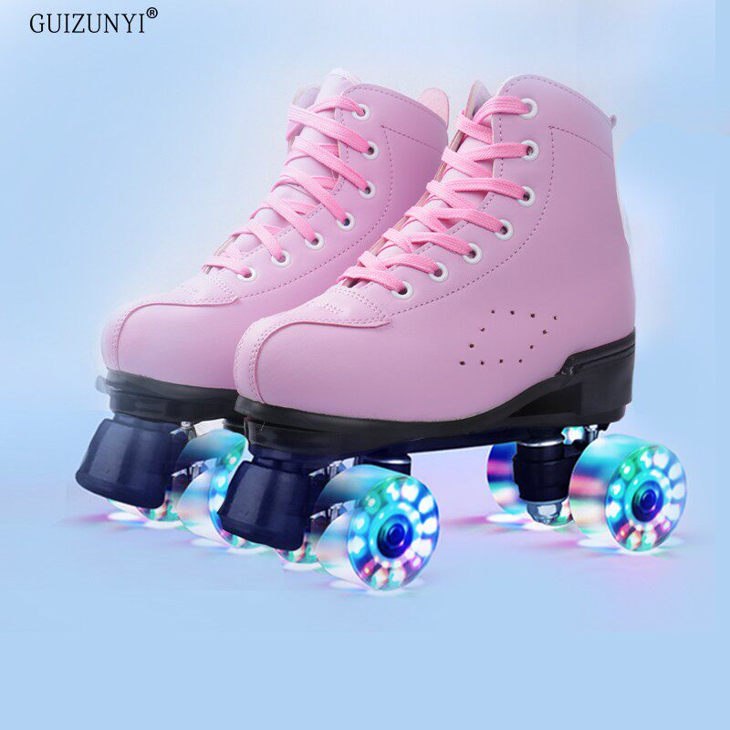 粉紫色闪光轮双排轮滑鞋 四轮旱冰鞋 绿色溜冰鞋 成人男女双排皮款