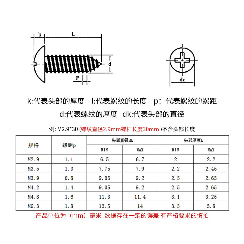 304不锈钢十字盘头螺钉圆头自攻螺丝木螺丝尖尾大头M1M2M3M4M5M6