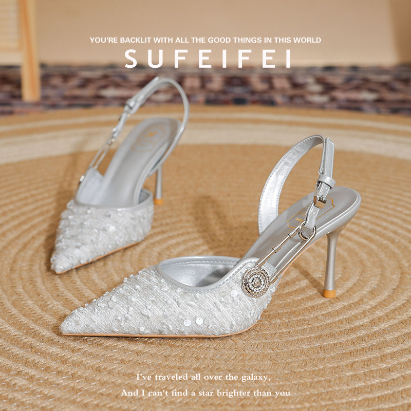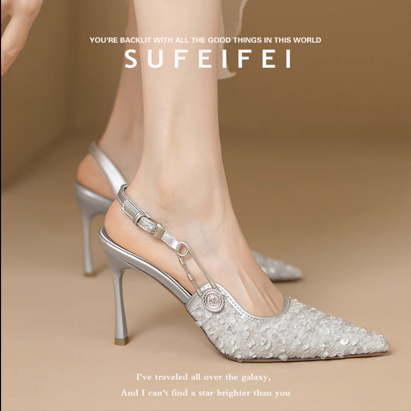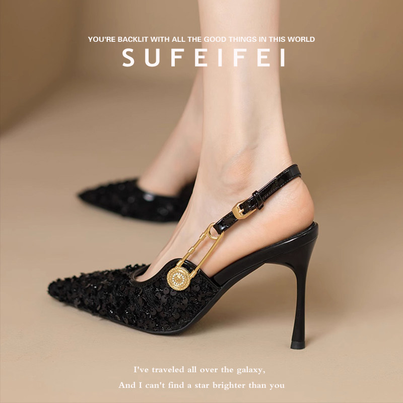 一字扣单鞋 苏妃妃春季 女细跟亮片包头后空凉鞋 尖头绝美高跟鞋 新款