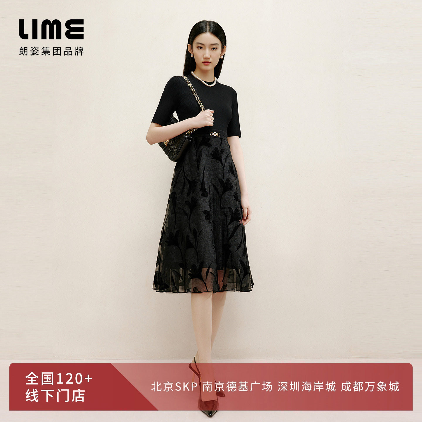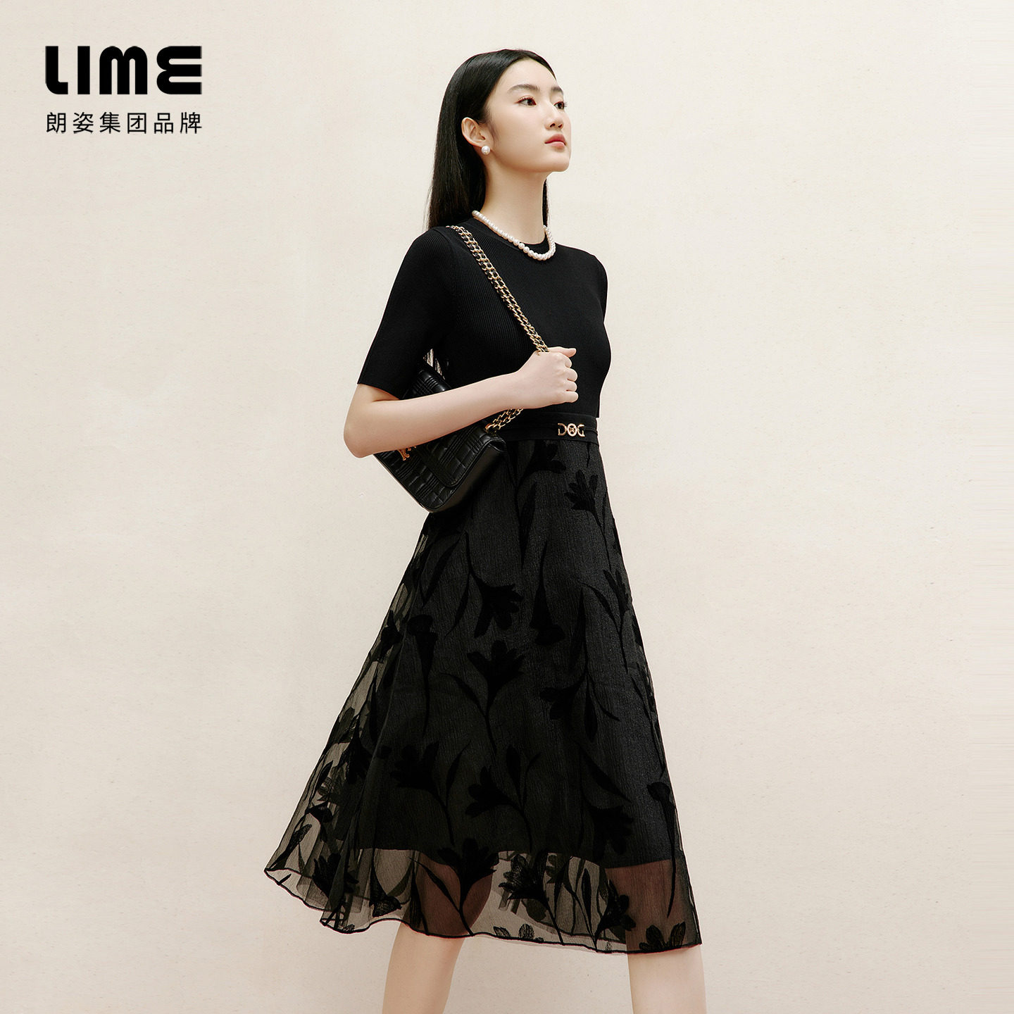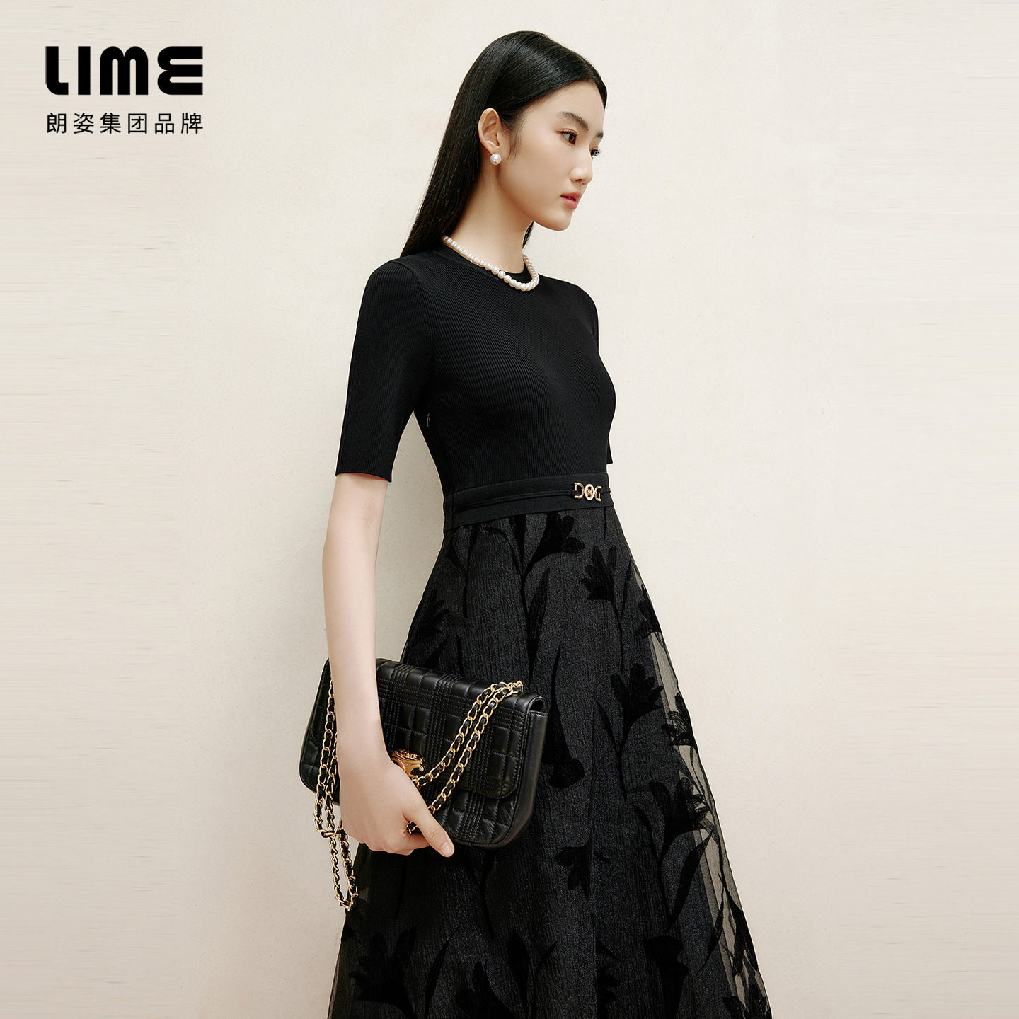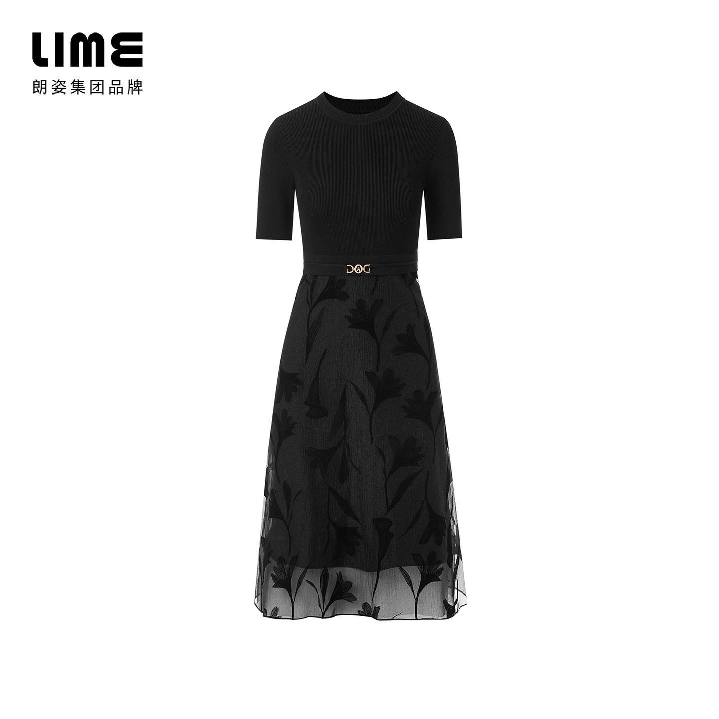 朗姿集团LIME莱茵针织拼接蕾丝花卉连衣裙黑色25夏简约显瘦长裙