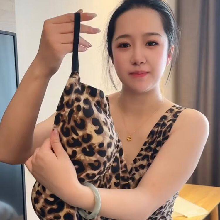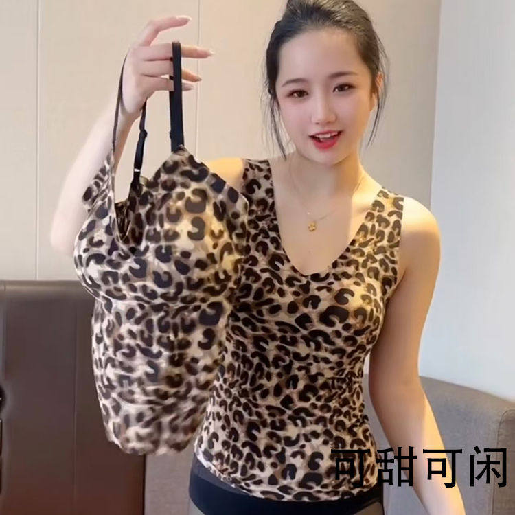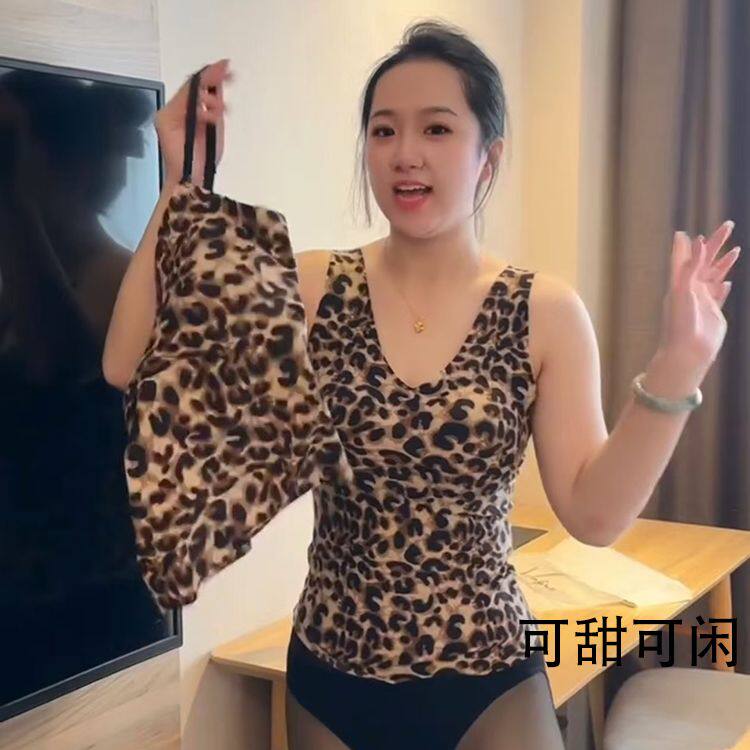 性感豹纹加绒带胸垫吊带背心女士大码 胖mm无痕自发热磨毛保暖上衣