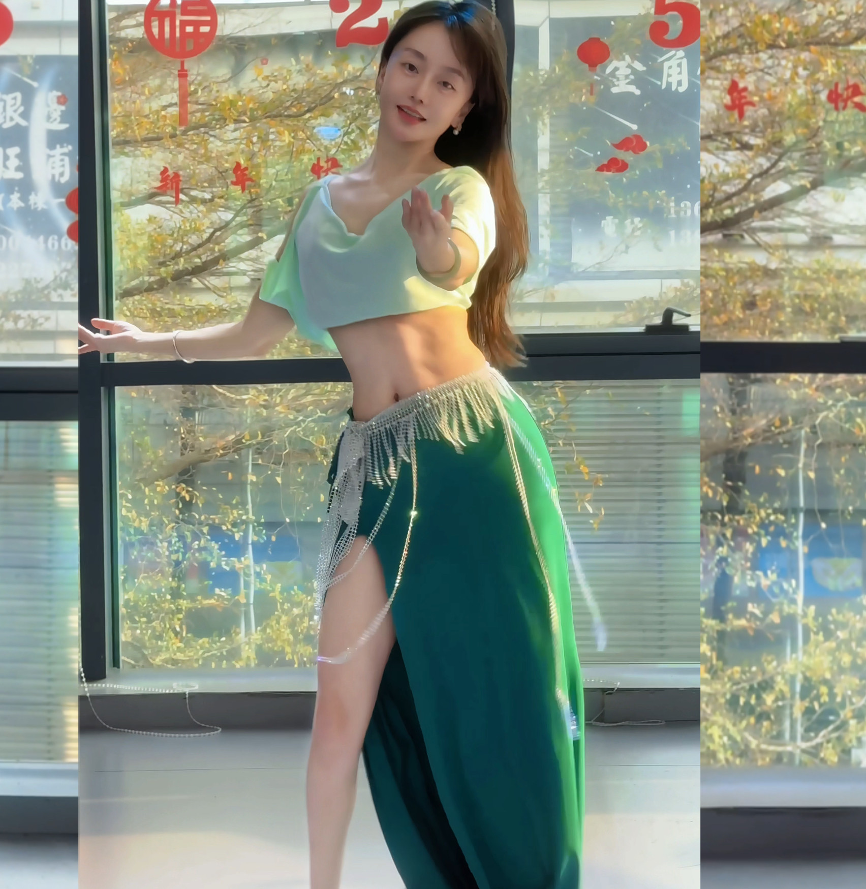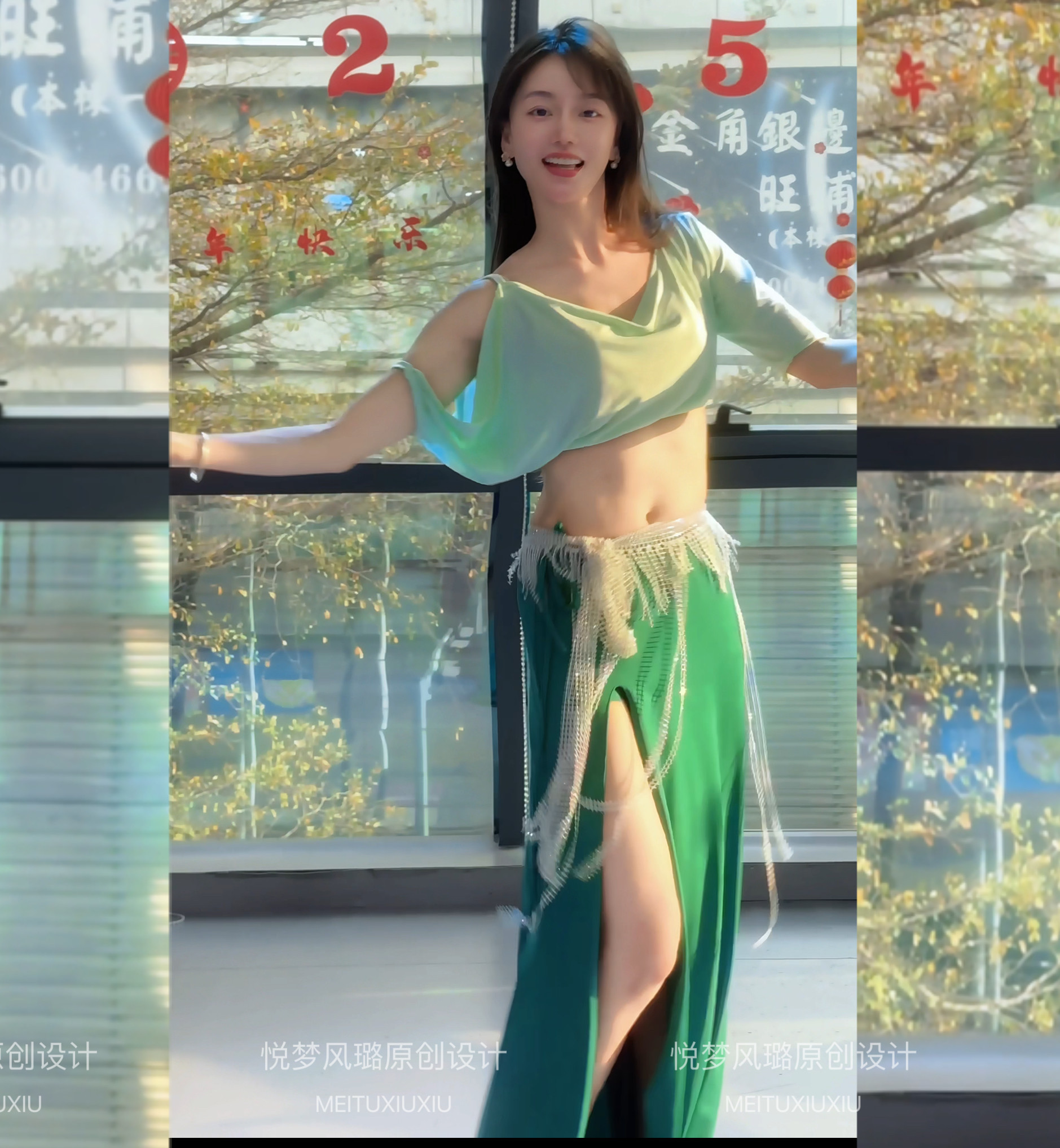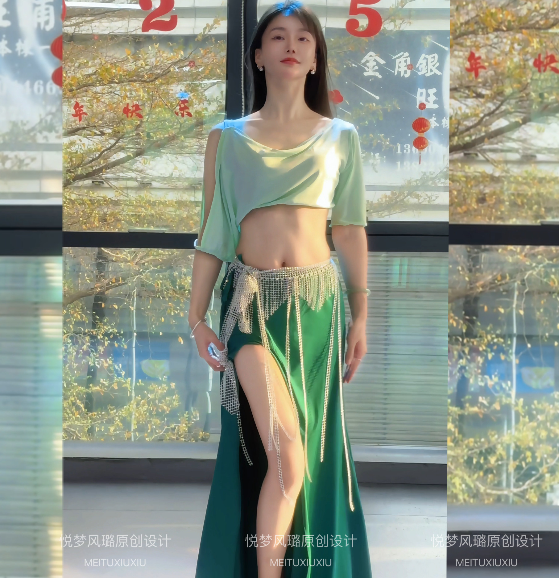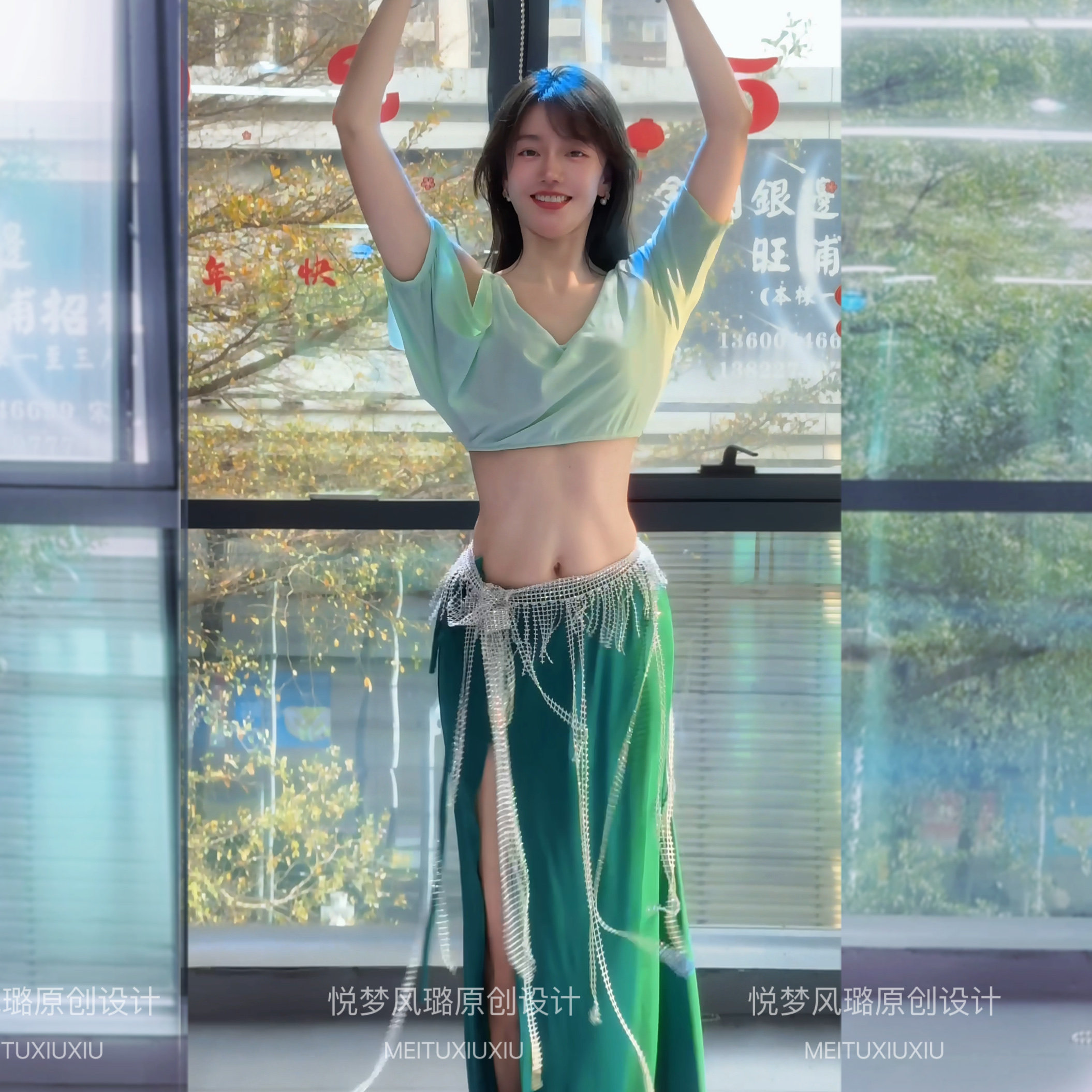 悦梦风璐肚皮舞新款 演出服班显瘦性感气质绿色仙女练功服长裙 套装