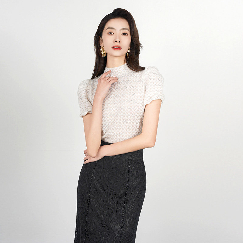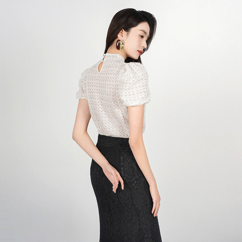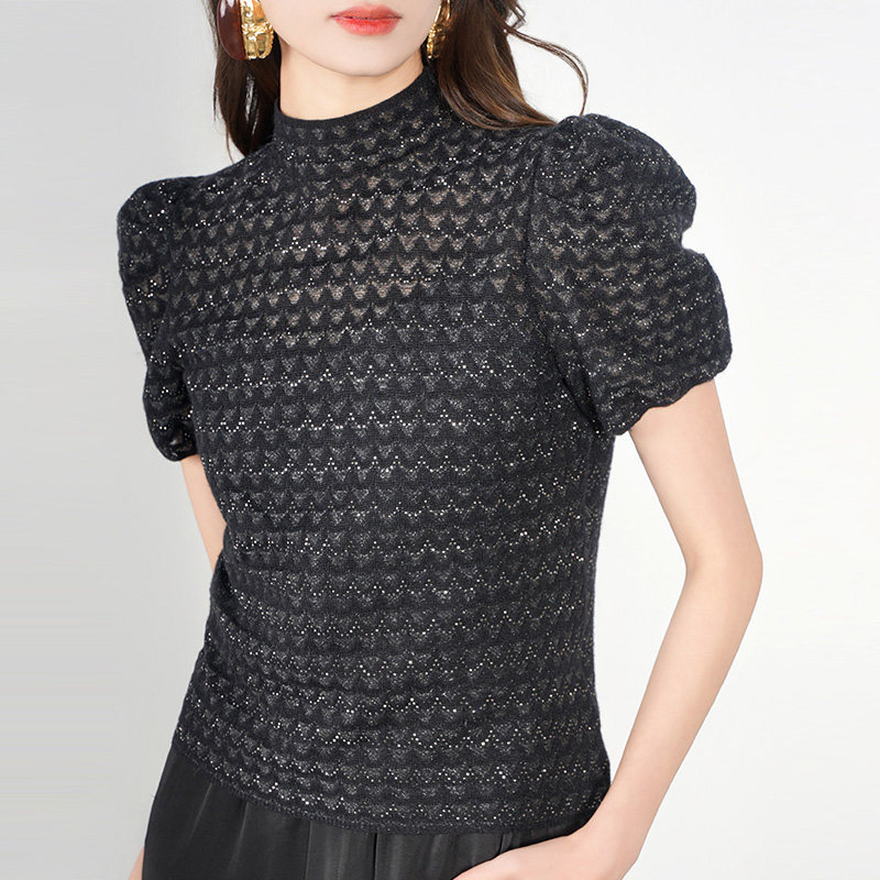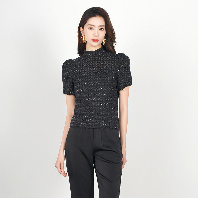上衣气质泡泡袖 优雅百搭短袖 烫钻T恤女eahchanie 新款 奕辰2025夏季