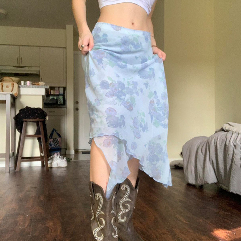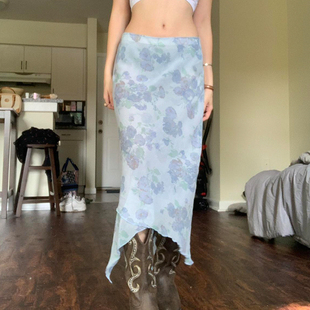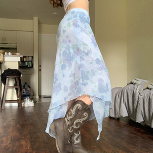 ROCKMORE 南法浪漫印花蓝调网纱半裙纯欲不规则度假裙 那不勒斯