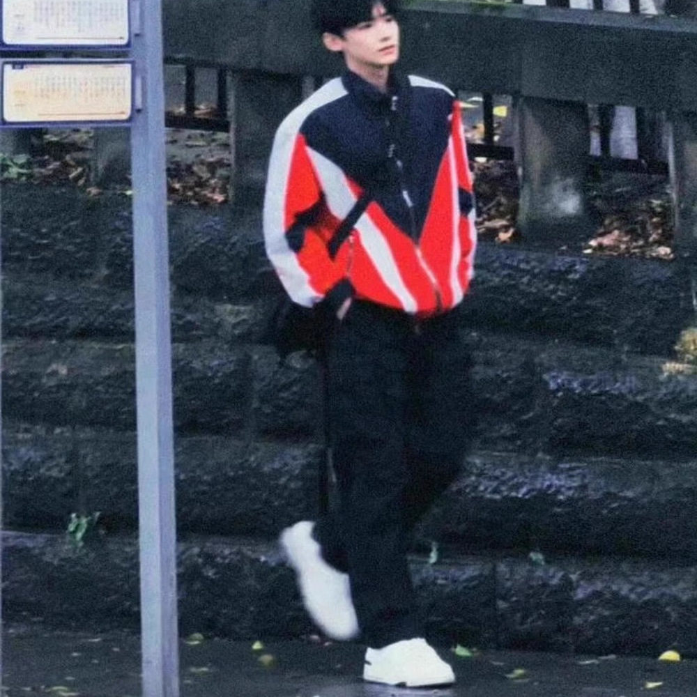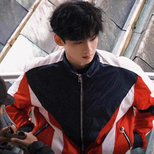 欧洲白敬亭之同款 翻领夹克高街潮牌拉链外套 难哄红色拼接机车美式