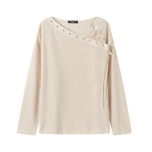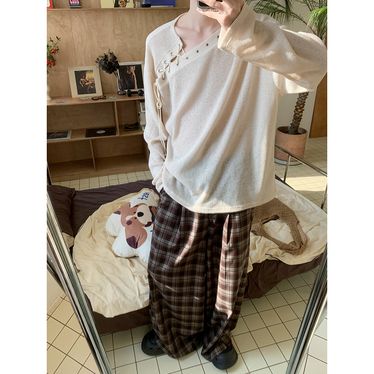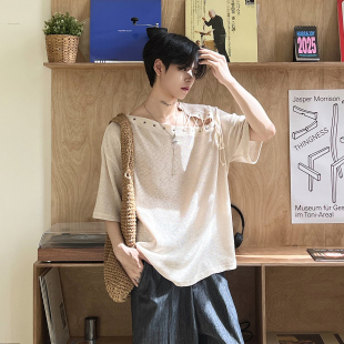 长袖 白口阳 镂空T恤男生夏季 斜肩薄款 上衣设计感复古 错频拥抱