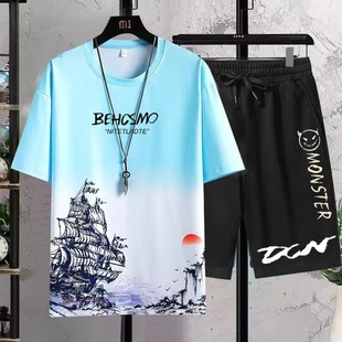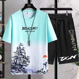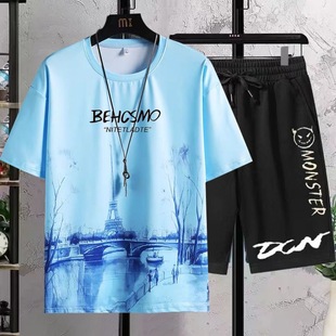 百搭冰丝上衣短裤 清仓捡漏休闲套装 学生时尚 t恤夏季 两件套 男短袖