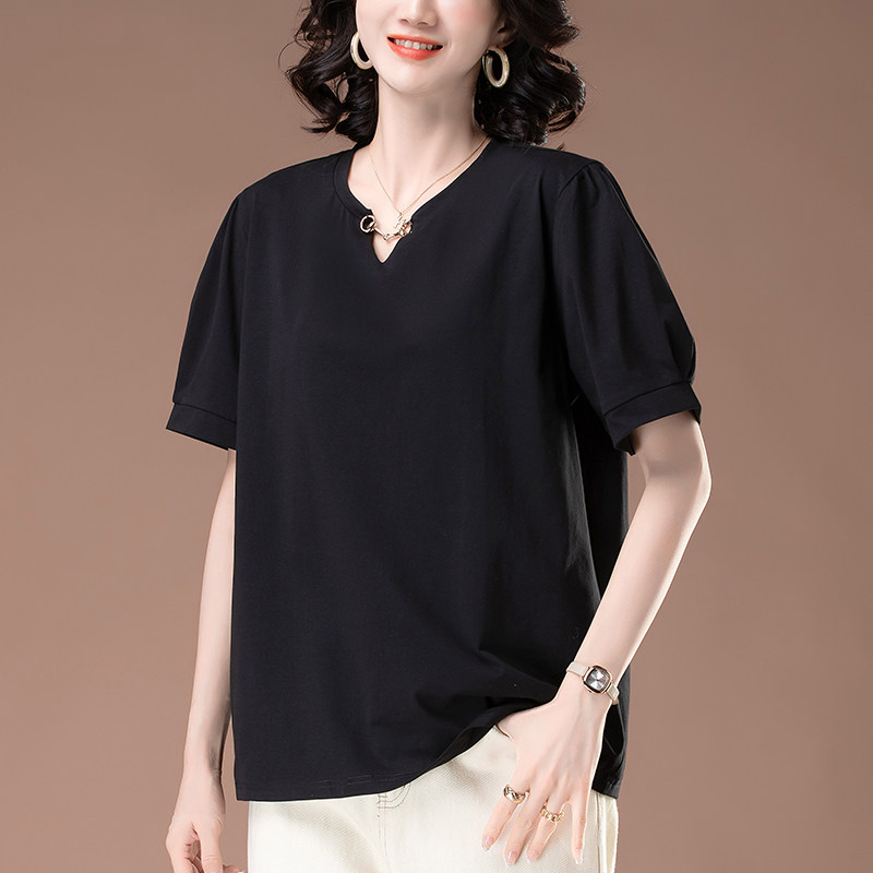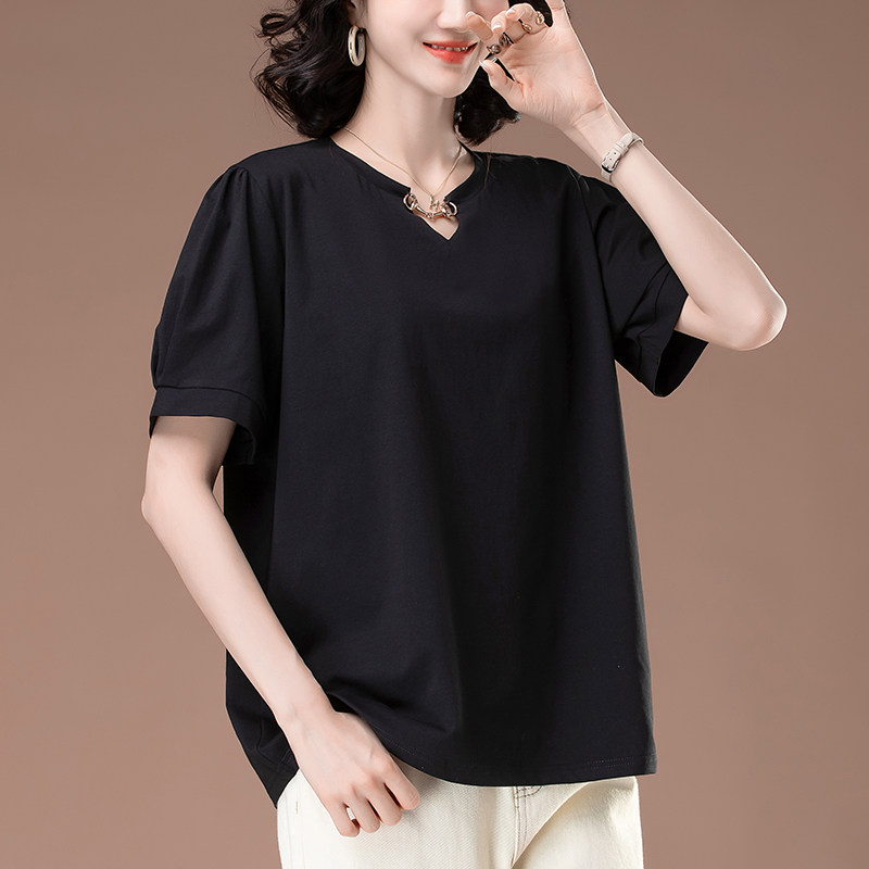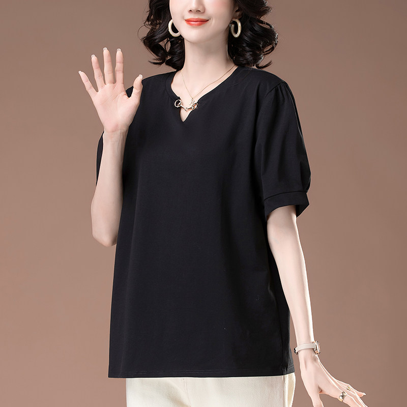 女装 短袖 加大码 新款 中年妈妈纯棉宽松遮肚子V领显瘦体恤 t恤女夏季