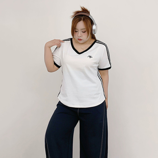 三条杠休闲v领正肩短袖 Milu家大码 美式 夏季 t恤胖mm显瘦上衣潮 女装