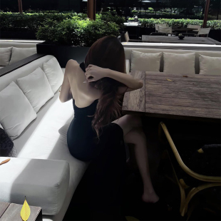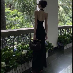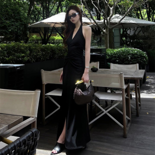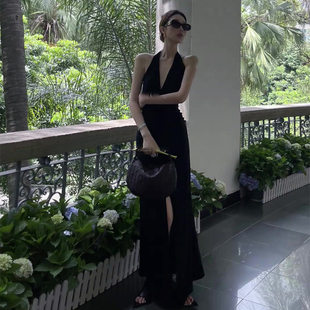 黑色V领露背挂脖连衣裙女春夏海边度假纯欲风气质性感开叉长裙子