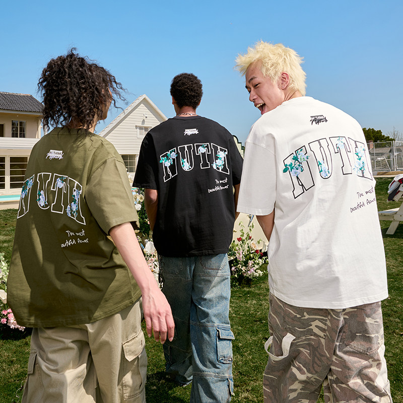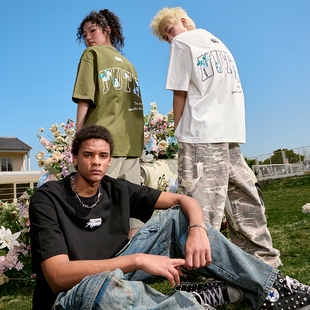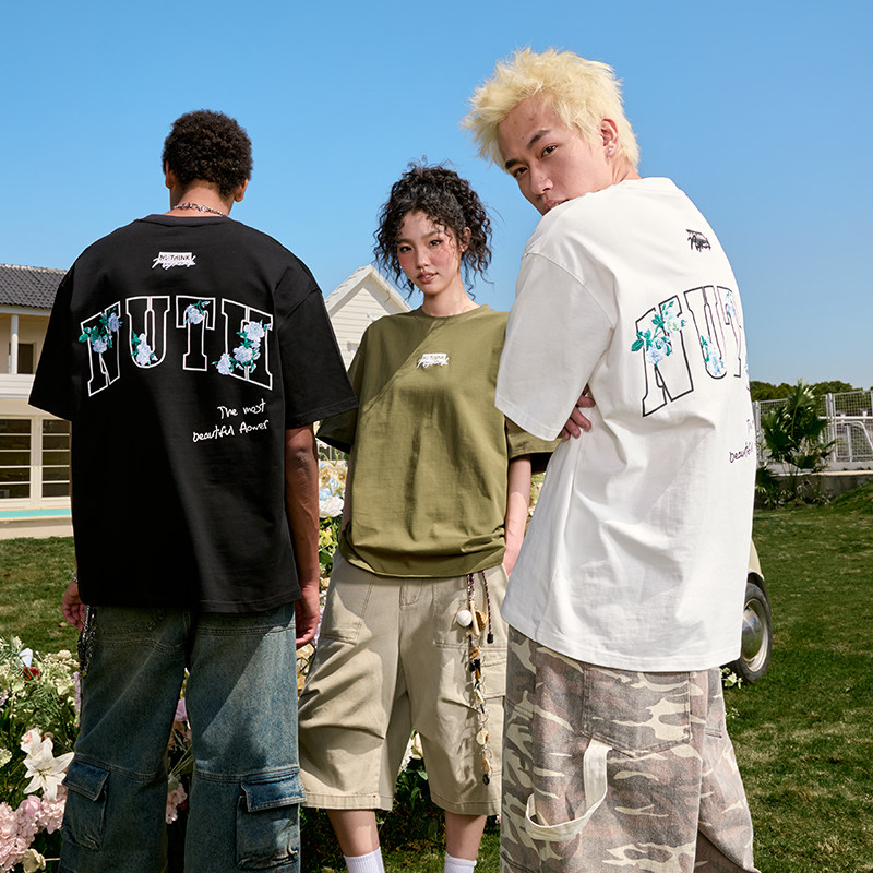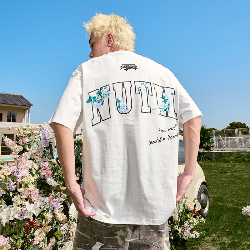 男女2025 复古潮牌宽松半袖 Nuthink山茶花刺绣重磅短袖 T恤字母美式