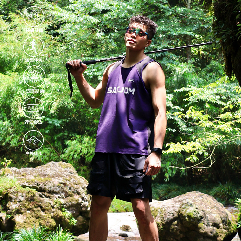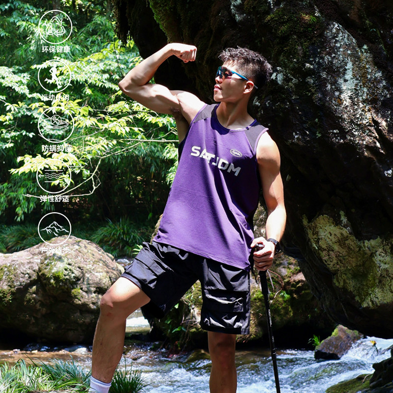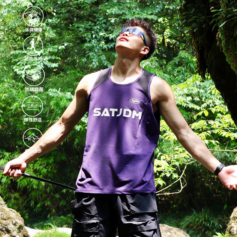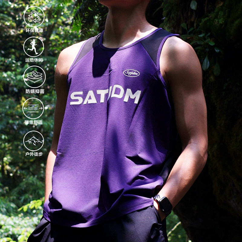 SATJDM凉感美式 窄肩拼接户外运动跑步国潮健身T恤 背心速干无袖