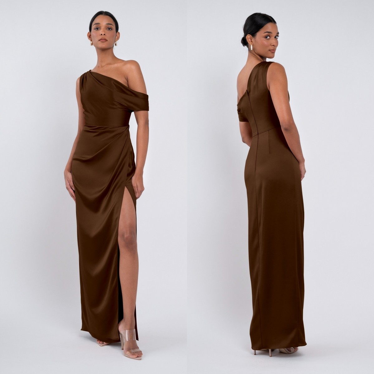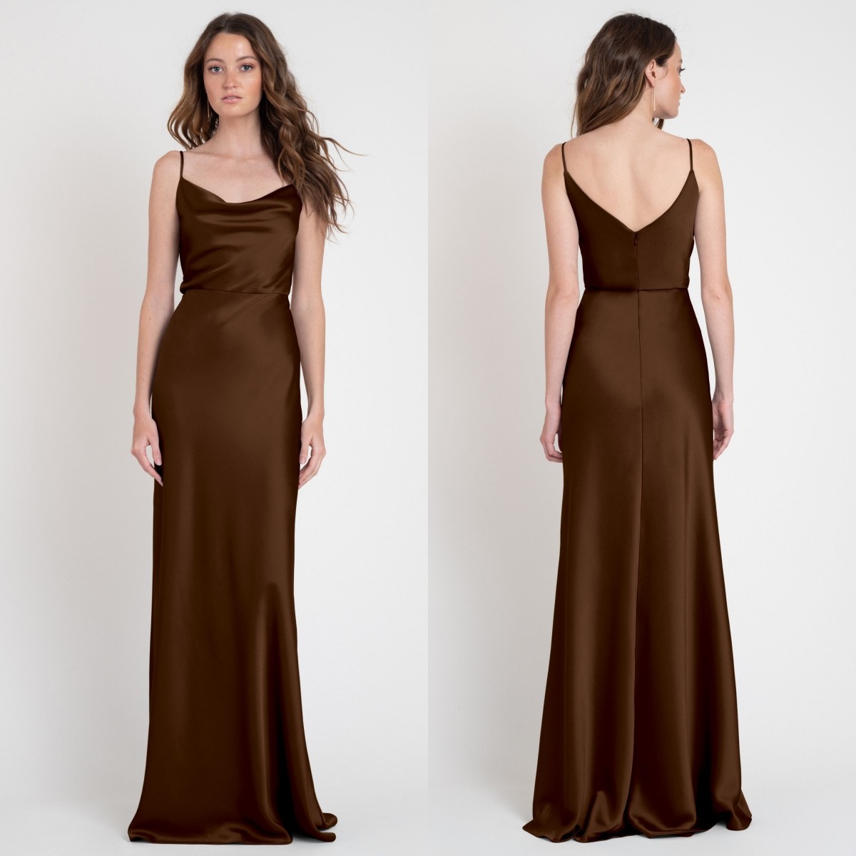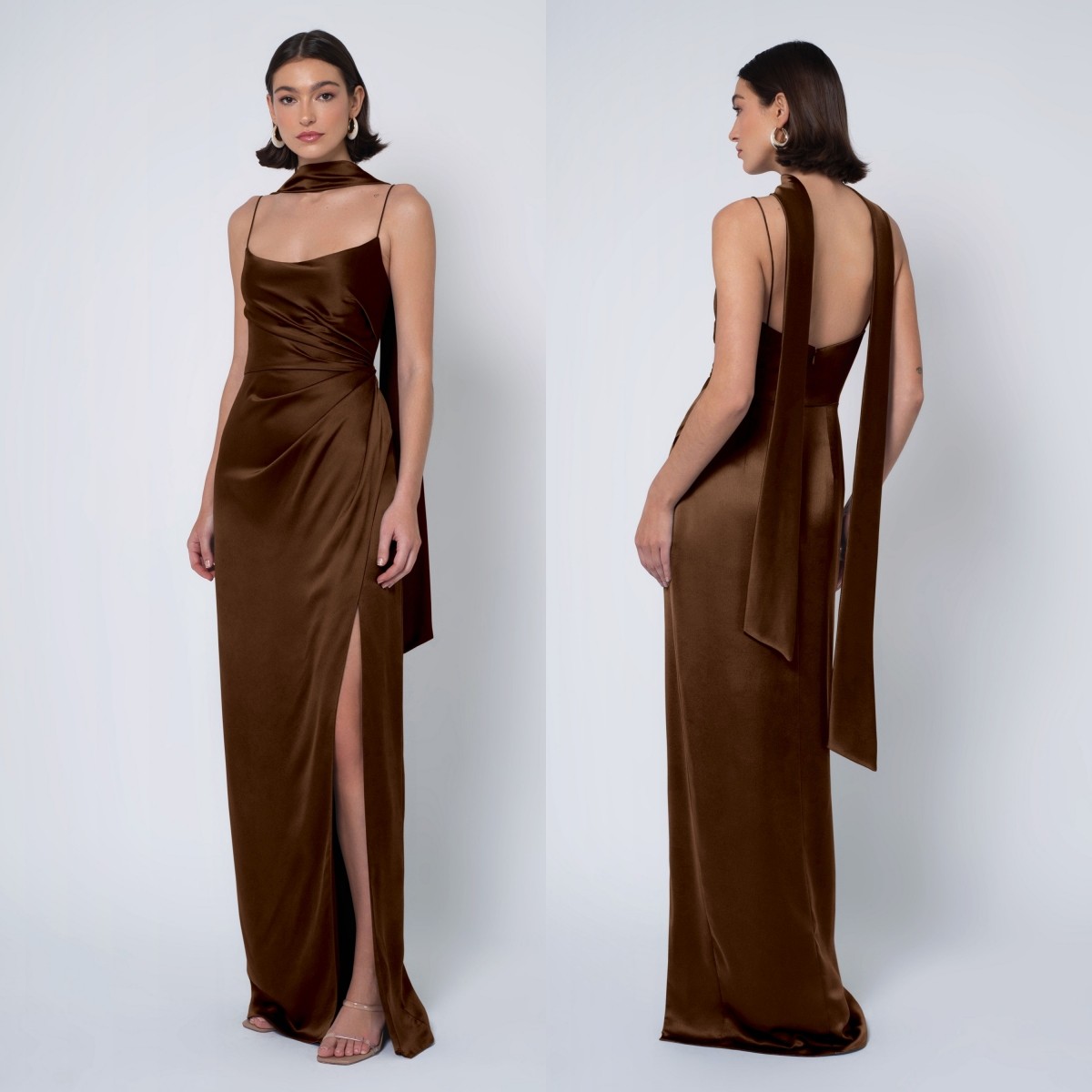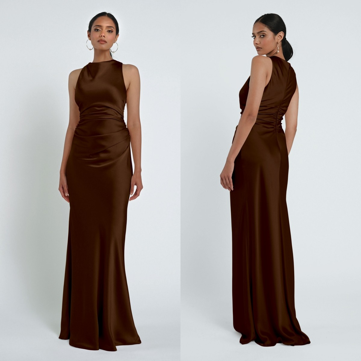 绝美气质咖啡色缎面伴娘服姐妹团礼服小众高级感伴娘裙大码
