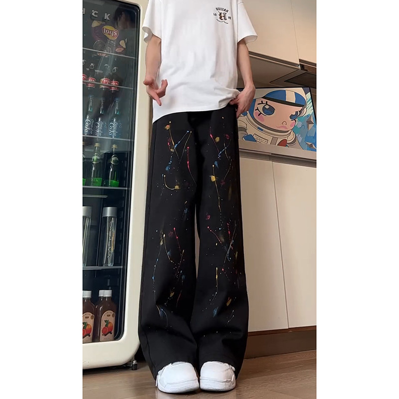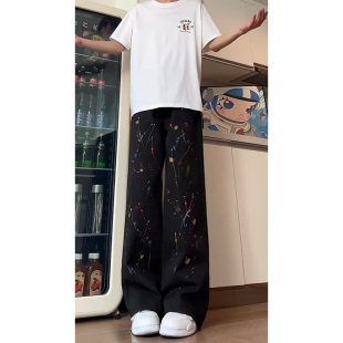 高街泼墨牛仔裤 子痞帅高级感直筒微喇裤 男夏季 潮牌裤 薄款 黑色美式
