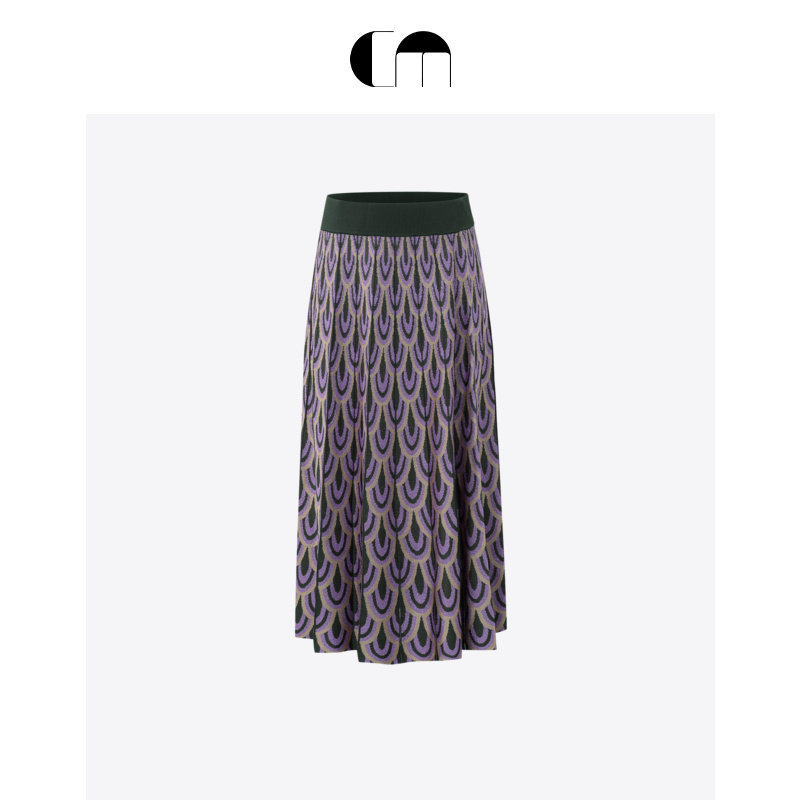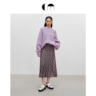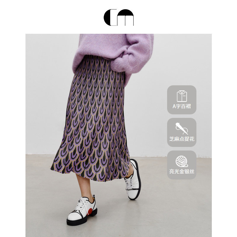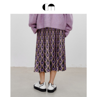 COMME 图案印花A字百褶针织紫色中长半身裙 MOI吕燕设计师早春女装