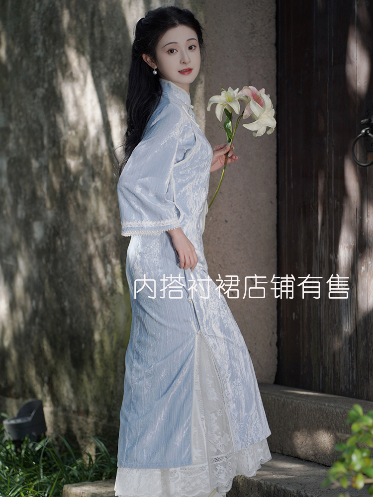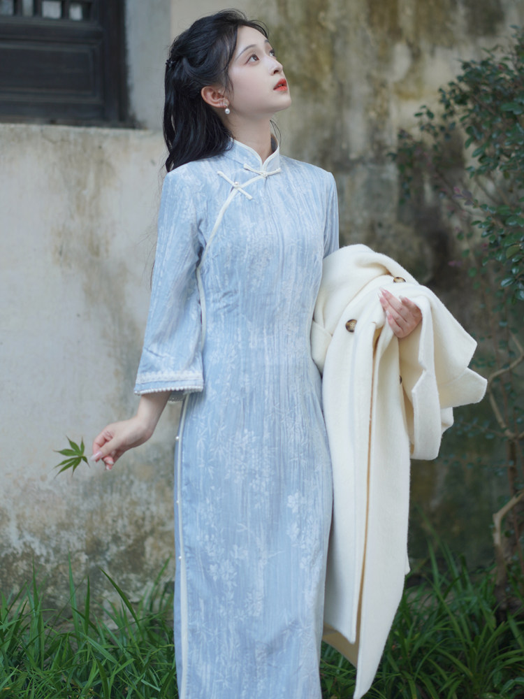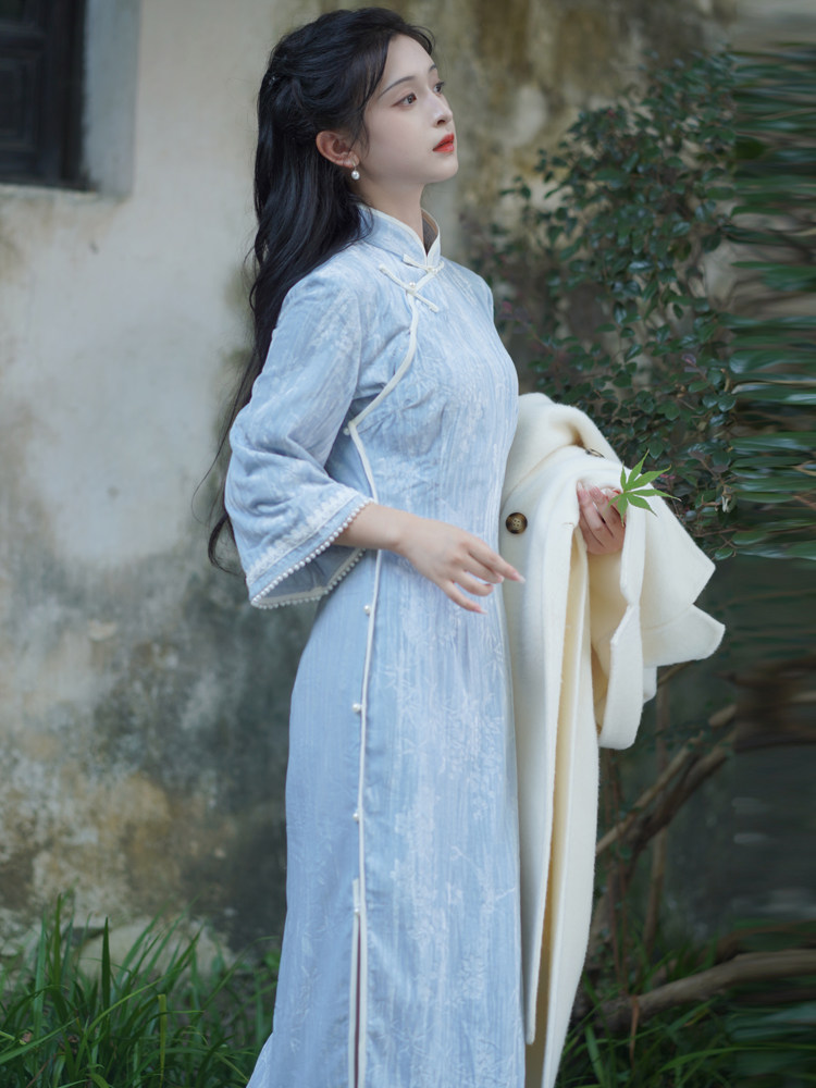 复古全开襟倒大袖 文艺清新蓝色少女连衣裙 丝绒旗袍2026年新款