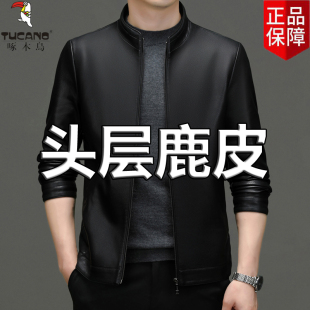啄木鸟海宁真皮皮衣男秋冬季 休闲翻领鹿皮皮夹克加绒加厚外套 新款