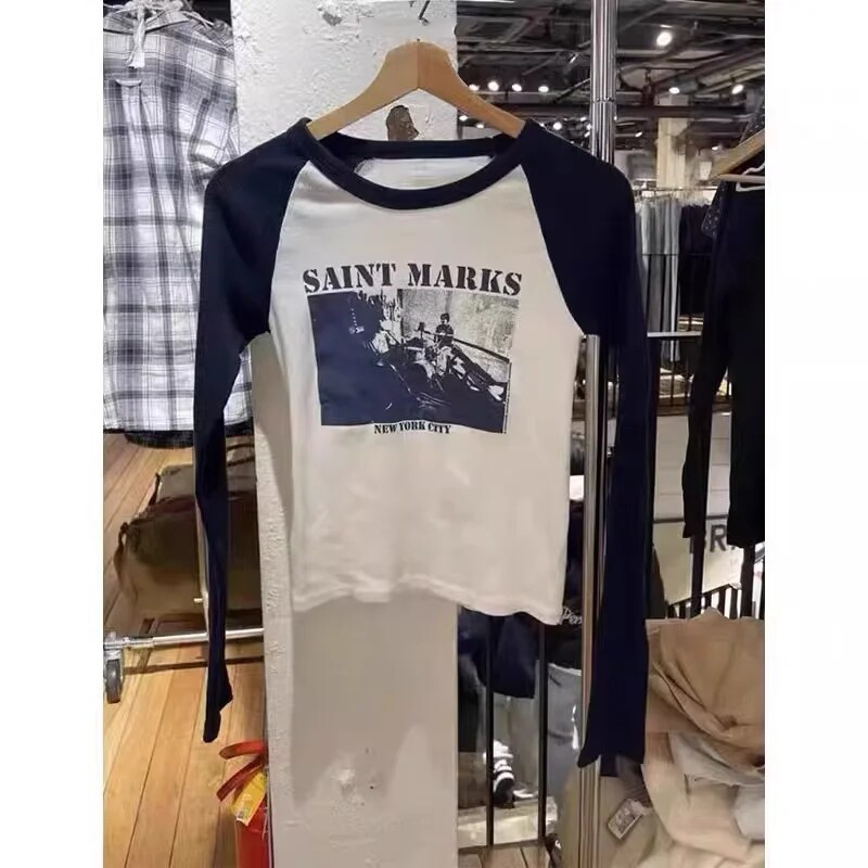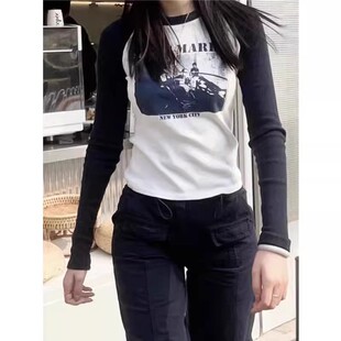 上衣bella Brandy T恤女bm纯棉修身 长袖 top Girl乐队印花插肩袖