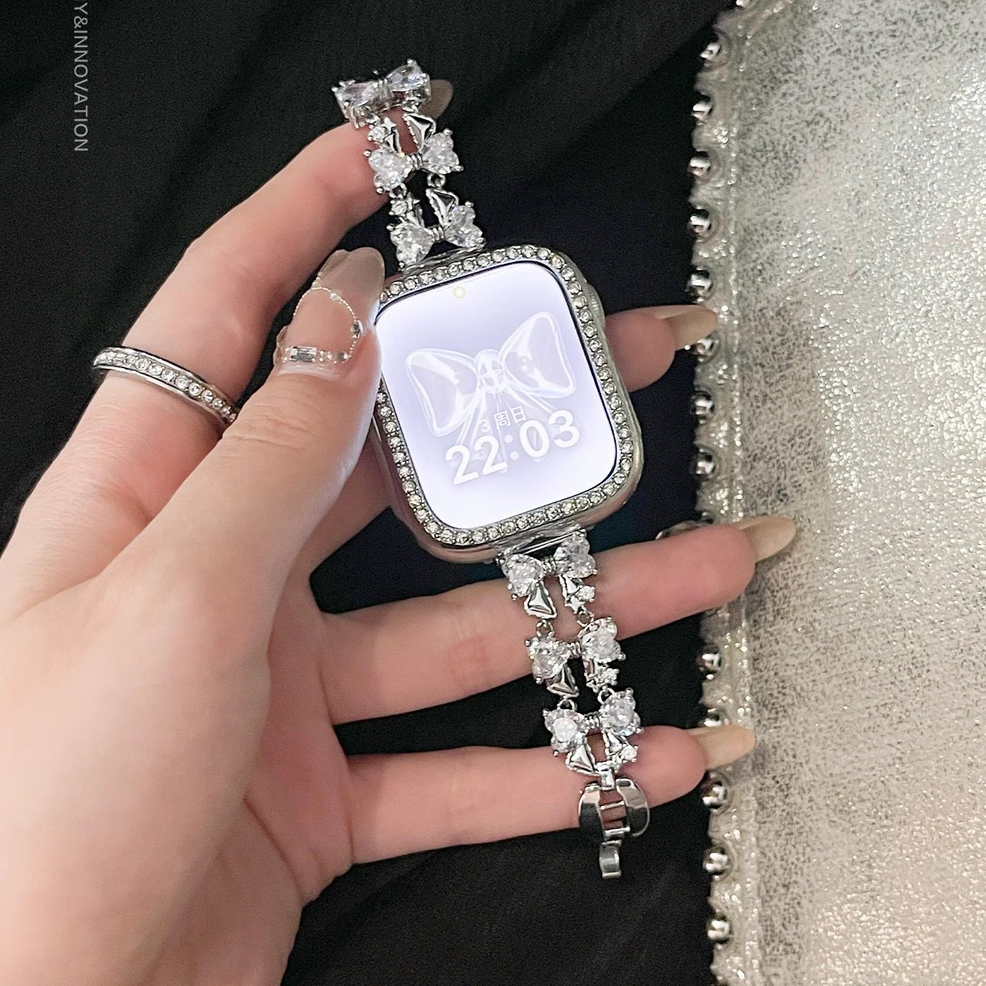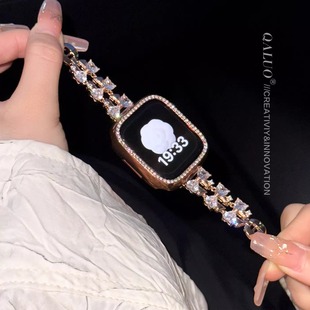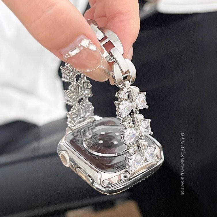 S10表带iwatch9苹果手表se QALUO秋季 5代41 watchS11 45mm小众女高级感 蝴蝶结锆石金属表带适用apple