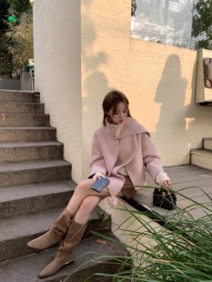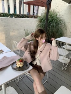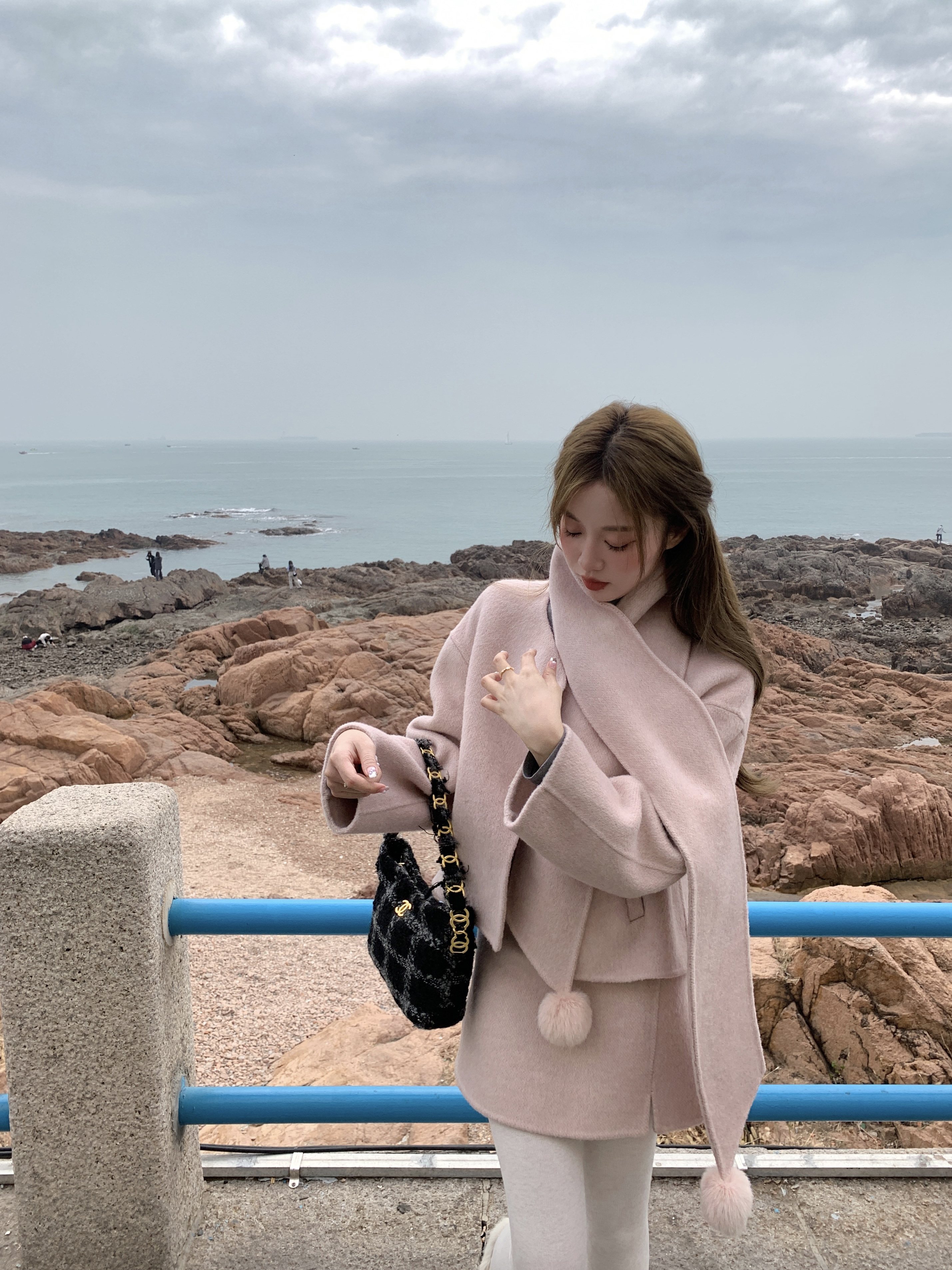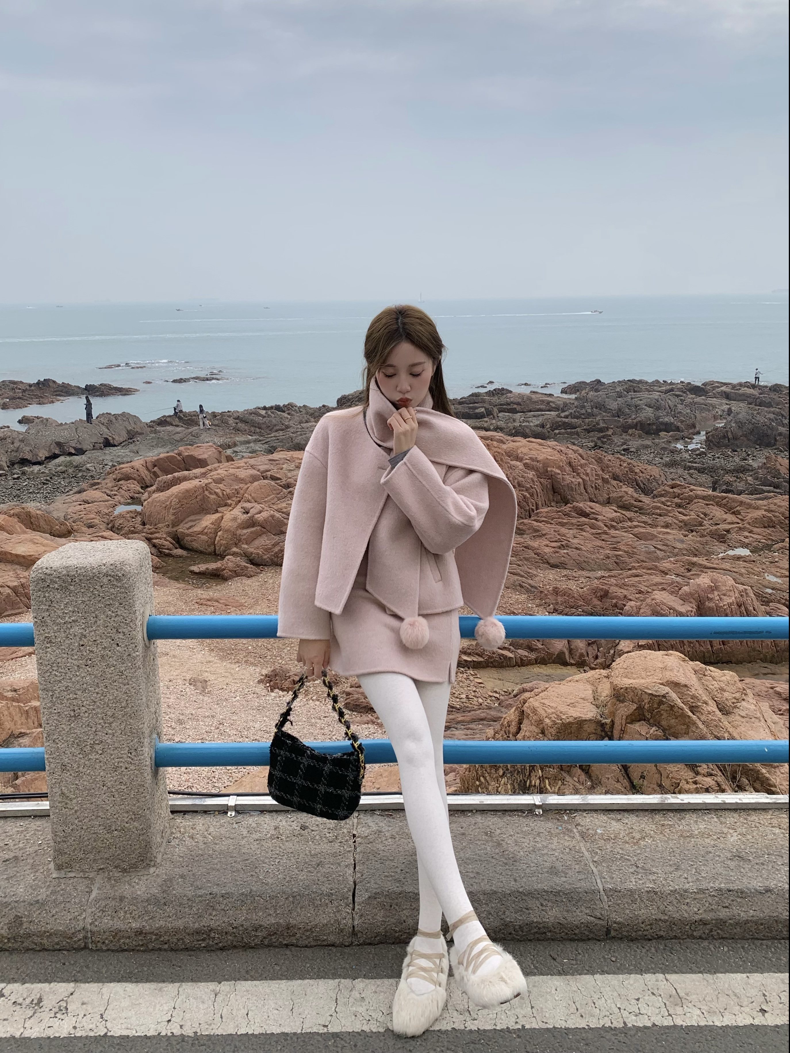 萌萌Ja」软心千金 羊毛双面呢气质两件套 韩系樱花粉外套短裙套装