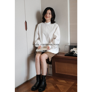 与她小众设计Oversize半高领宽松纯色棉立体剪裁茧型长袖 女 白衬衫