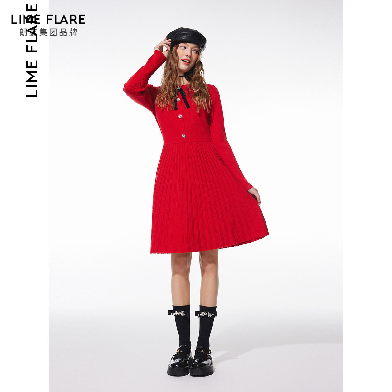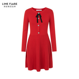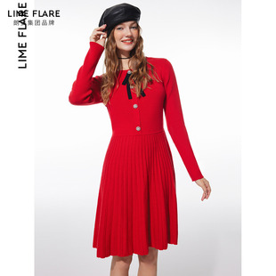莱茵福莱尔设计感气质红色春新款 收腰A字针织连衣裙洋气裙子