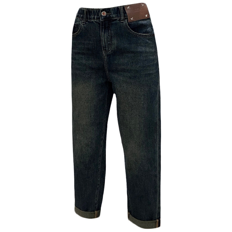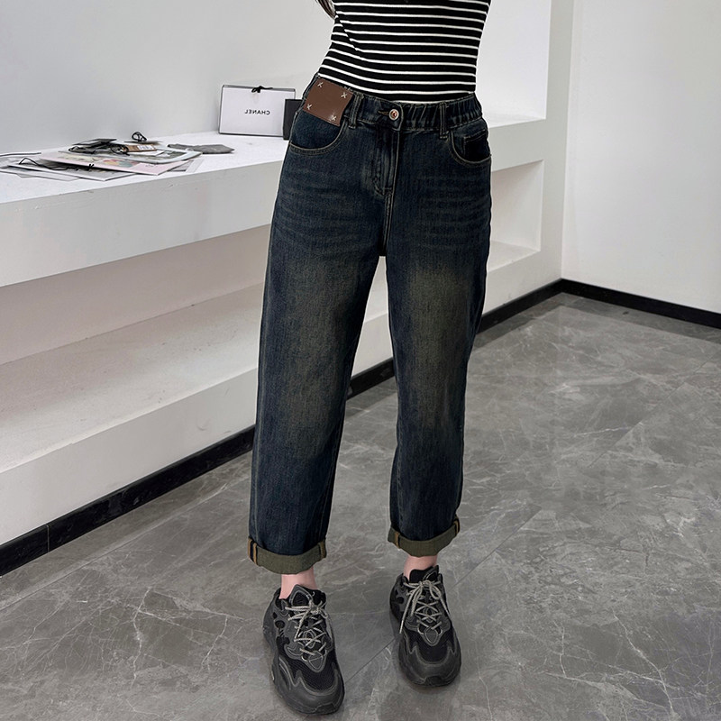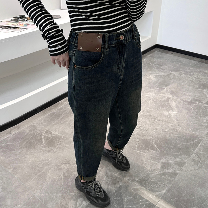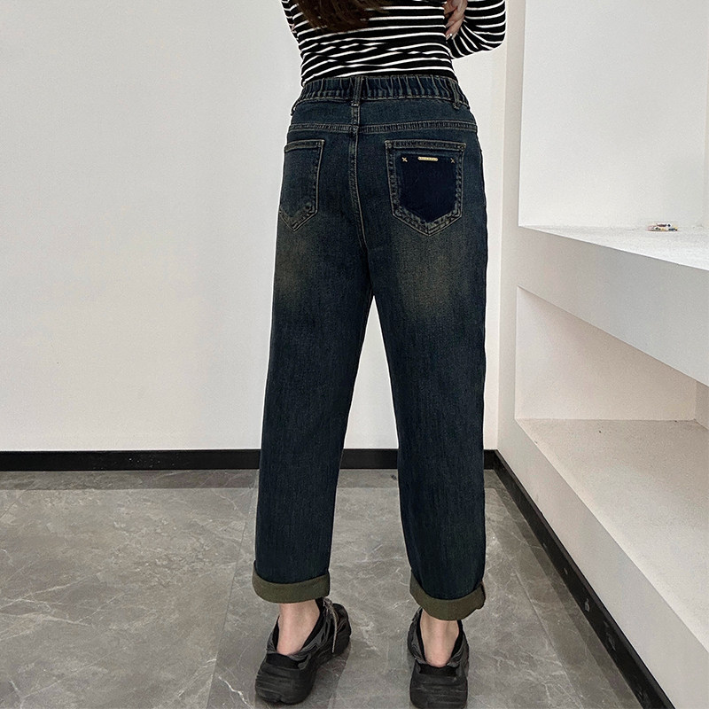 2025秋冬阿凡牛3035后松紧腰底抓毛薄绒宽松老爹垮裤 弹力女牛仔裤
