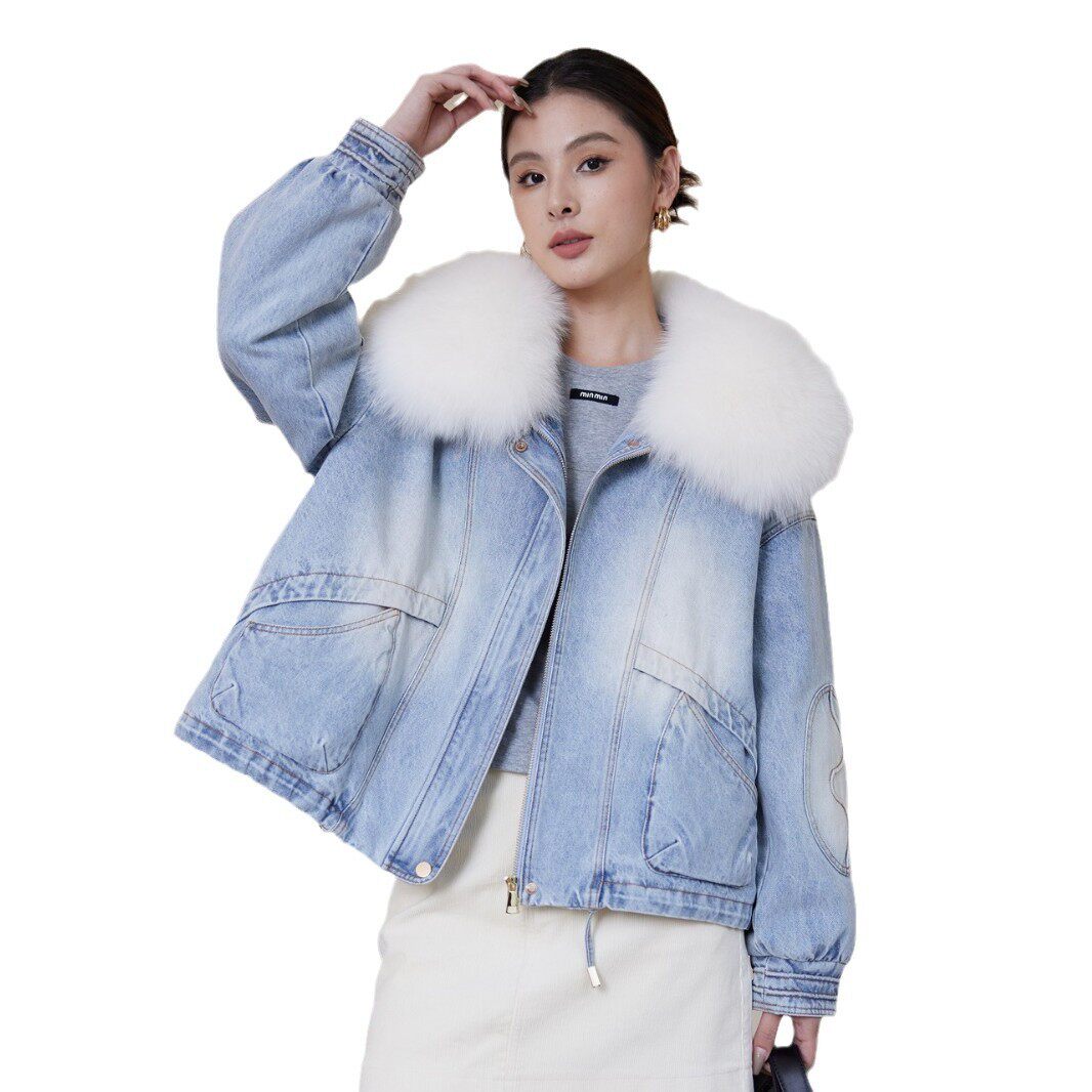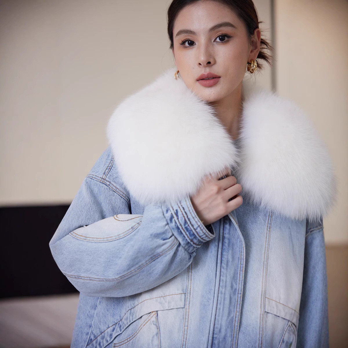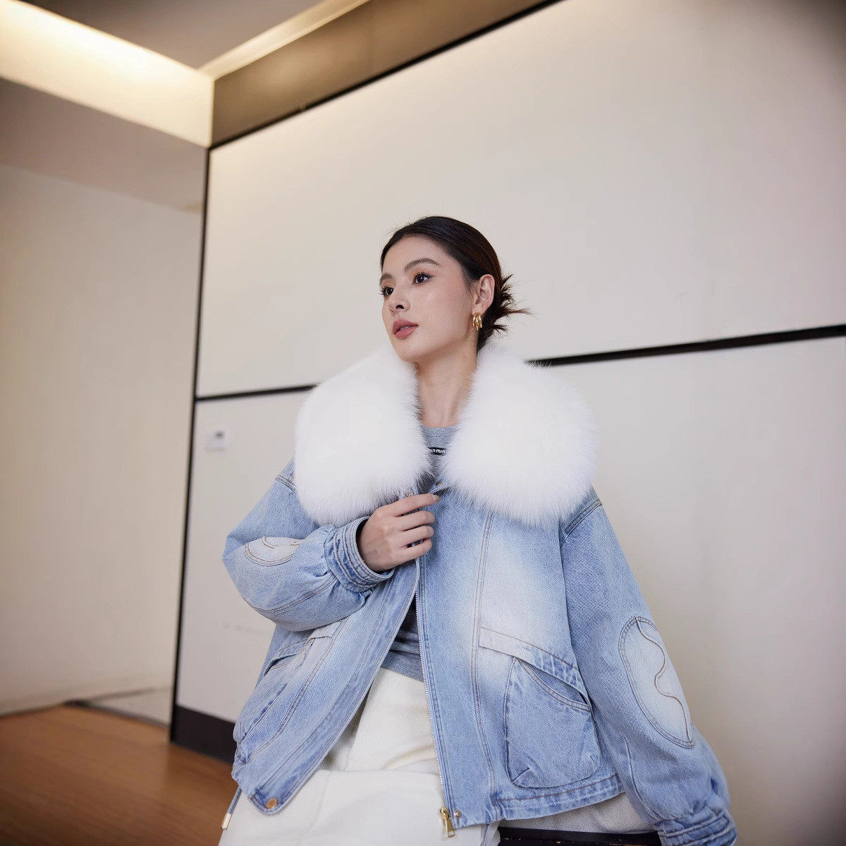 2024秋冬气质牛仔狐狸毛鹅绒内胆女短皮草外套小个子年轻款