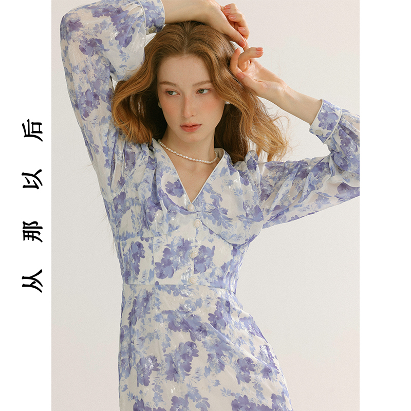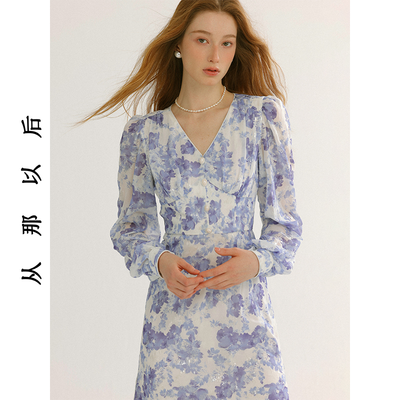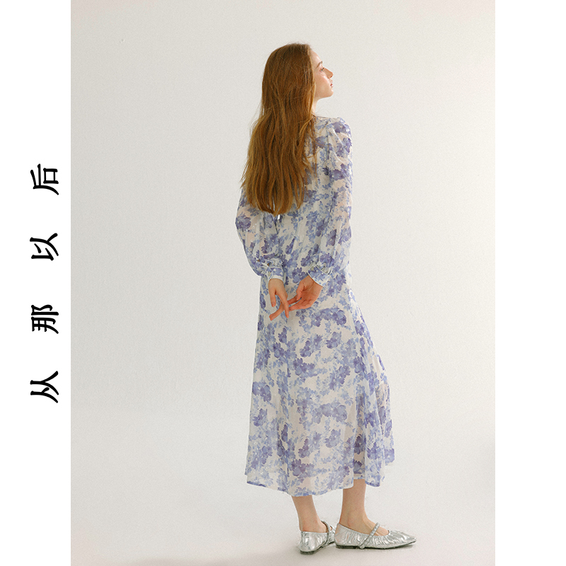 新款 裙子蓝色纱裙女春季 碎花连衣裙海边度假长裙长袖 从那以后法式