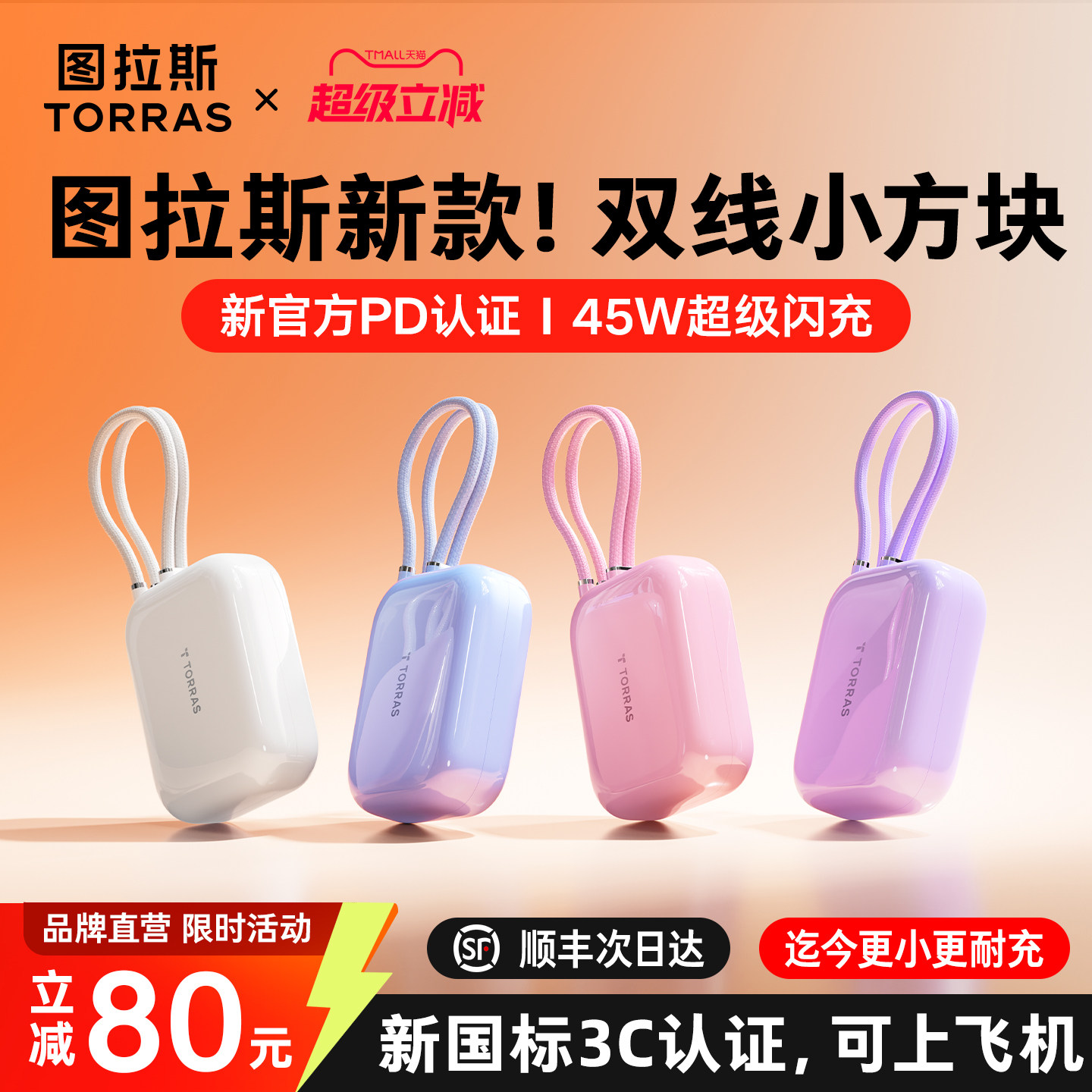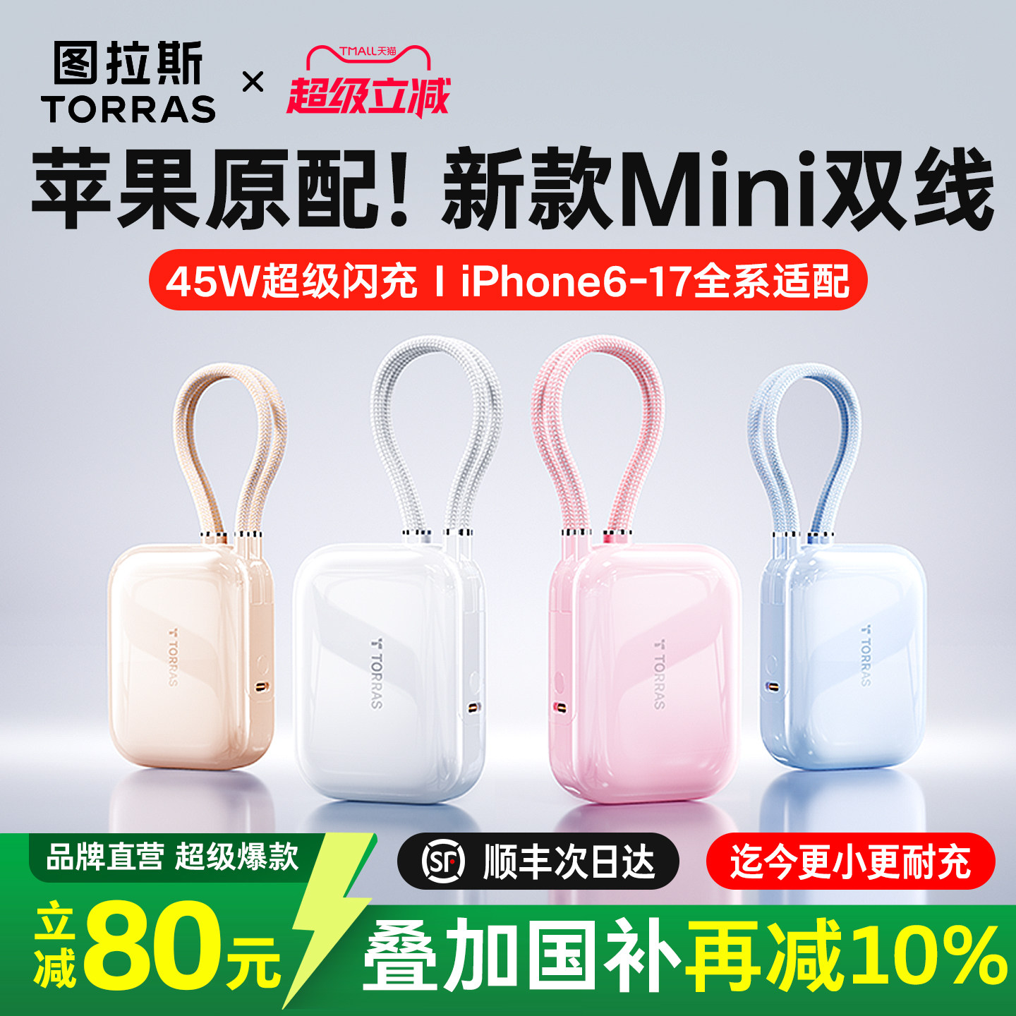 快充大容量20000毫安自带线小巧便携适用苹果17手机45W移动电源正品 图拉斯2026新款 充电宝3c认证可上飞机
