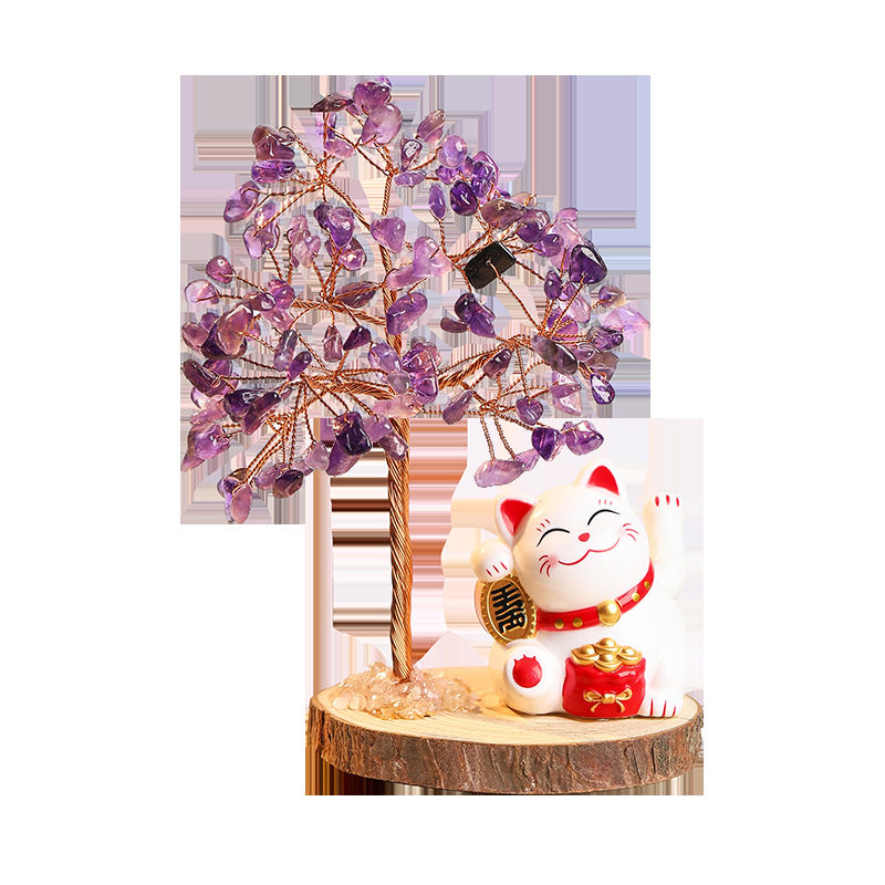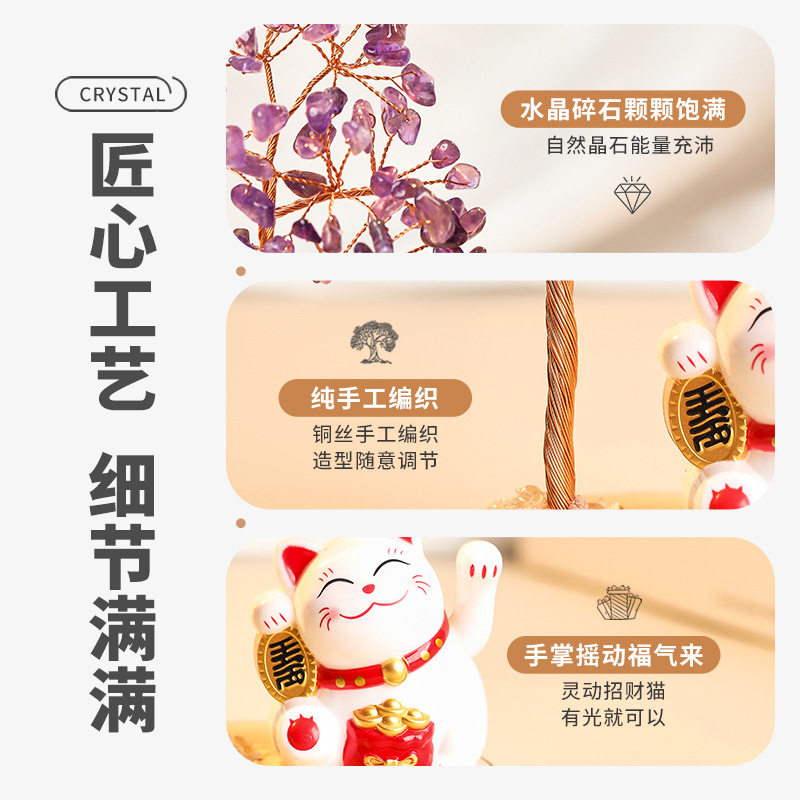 天然黄紫粉白水晶树发财树招财猫摆件车载桌面摆饰可爱礼物摆件