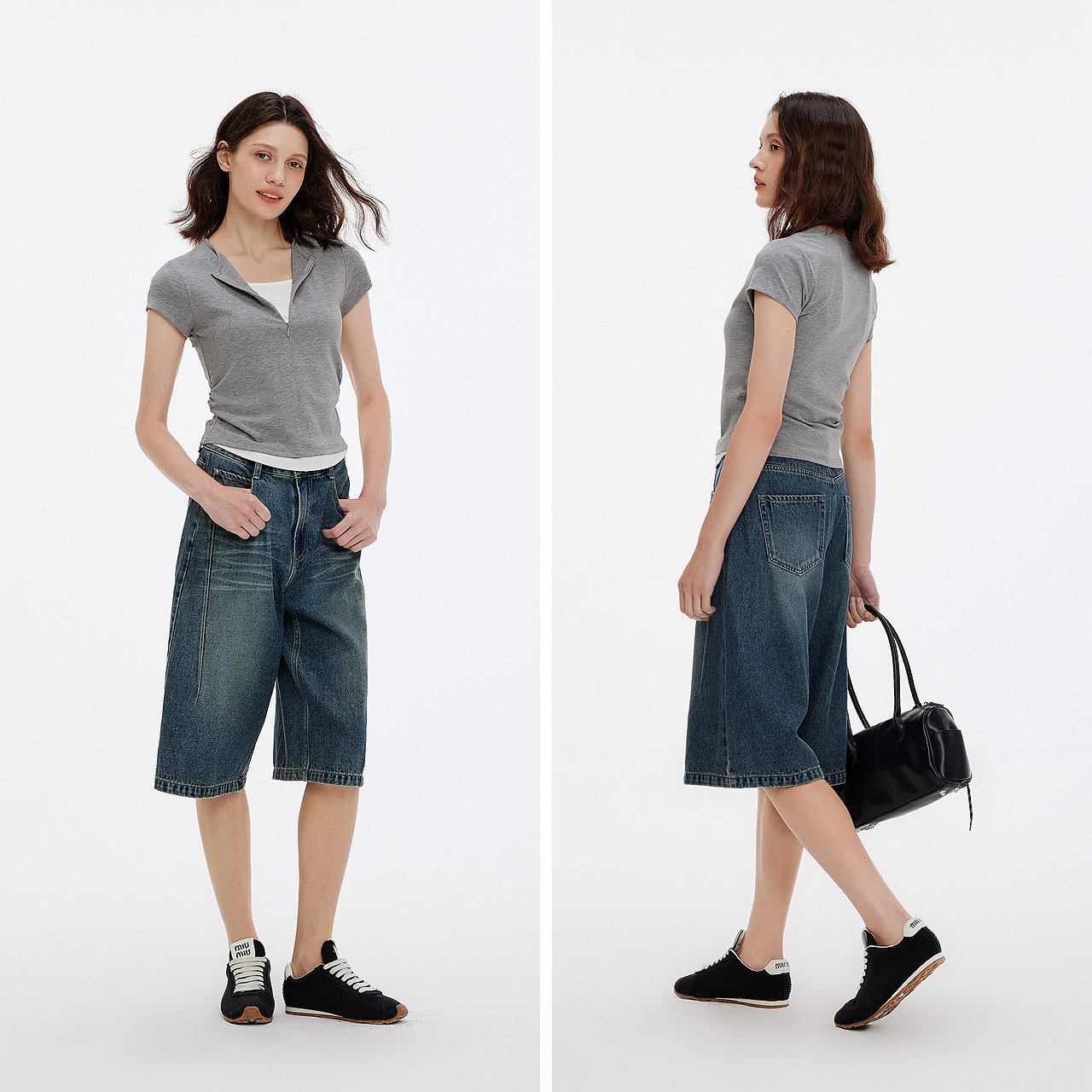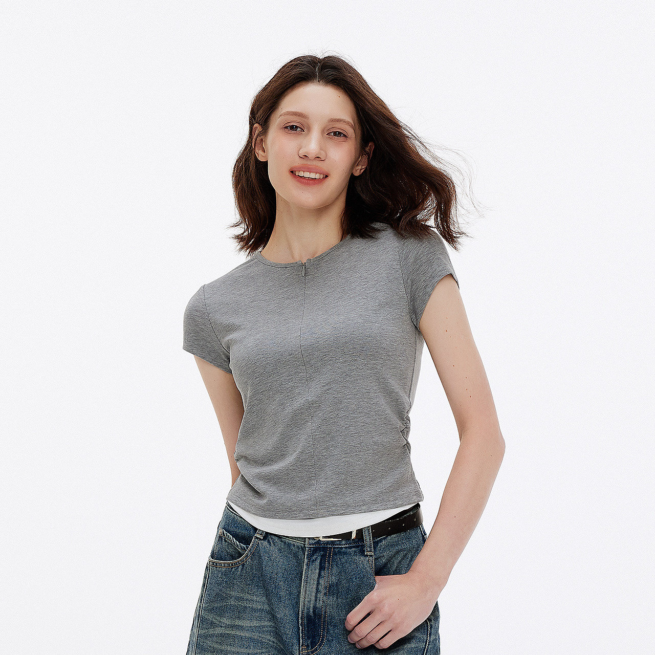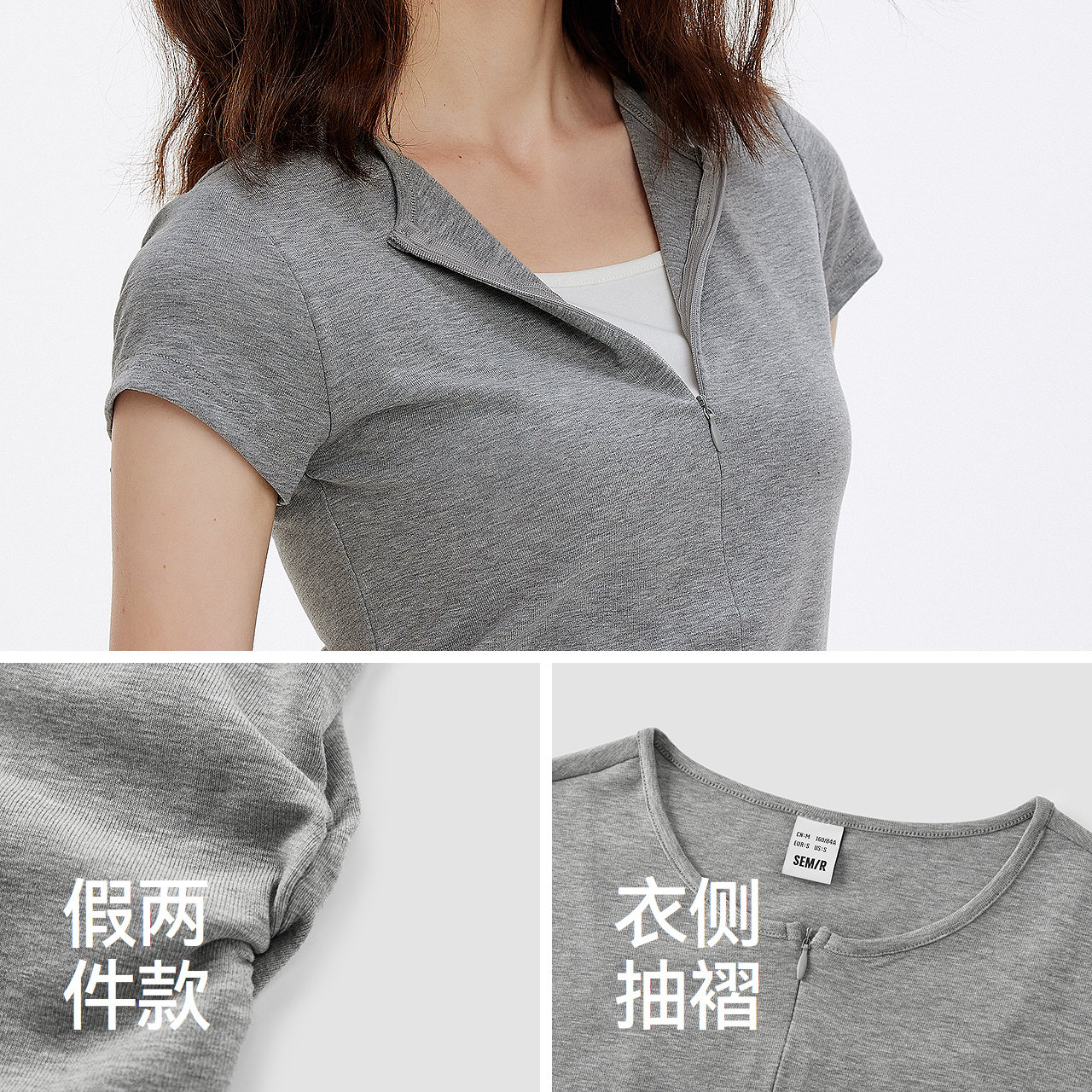 褶皱显瘦小心机百搭简约衣服 假两件撞色修身 森马短袖 T恤女夏短款