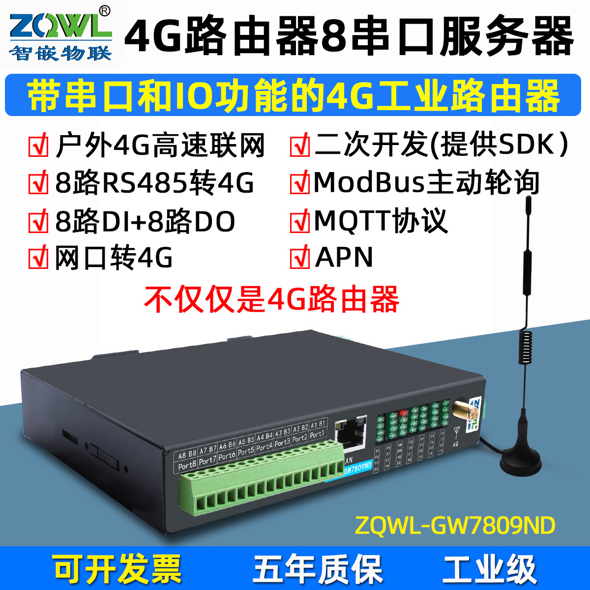 4G路由器插卡8路RS485转以太网模块串口转网口转4G无线移动全网通8路网络继电器控制板远程控制IO数据全网通