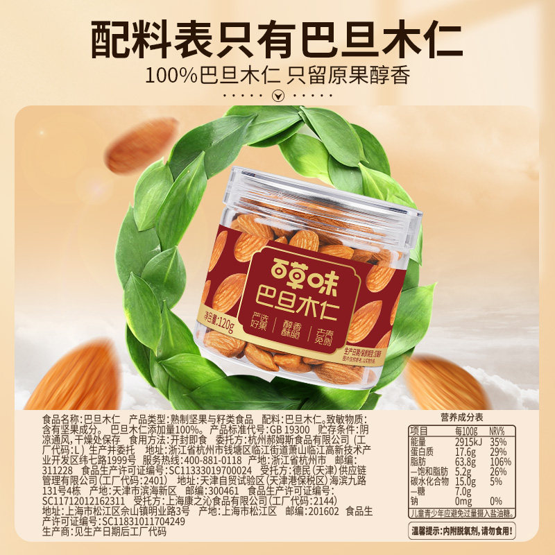 百草味巴旦木仁120g原味罐装 去壳果仁休闲健康零食坚果炒货干果