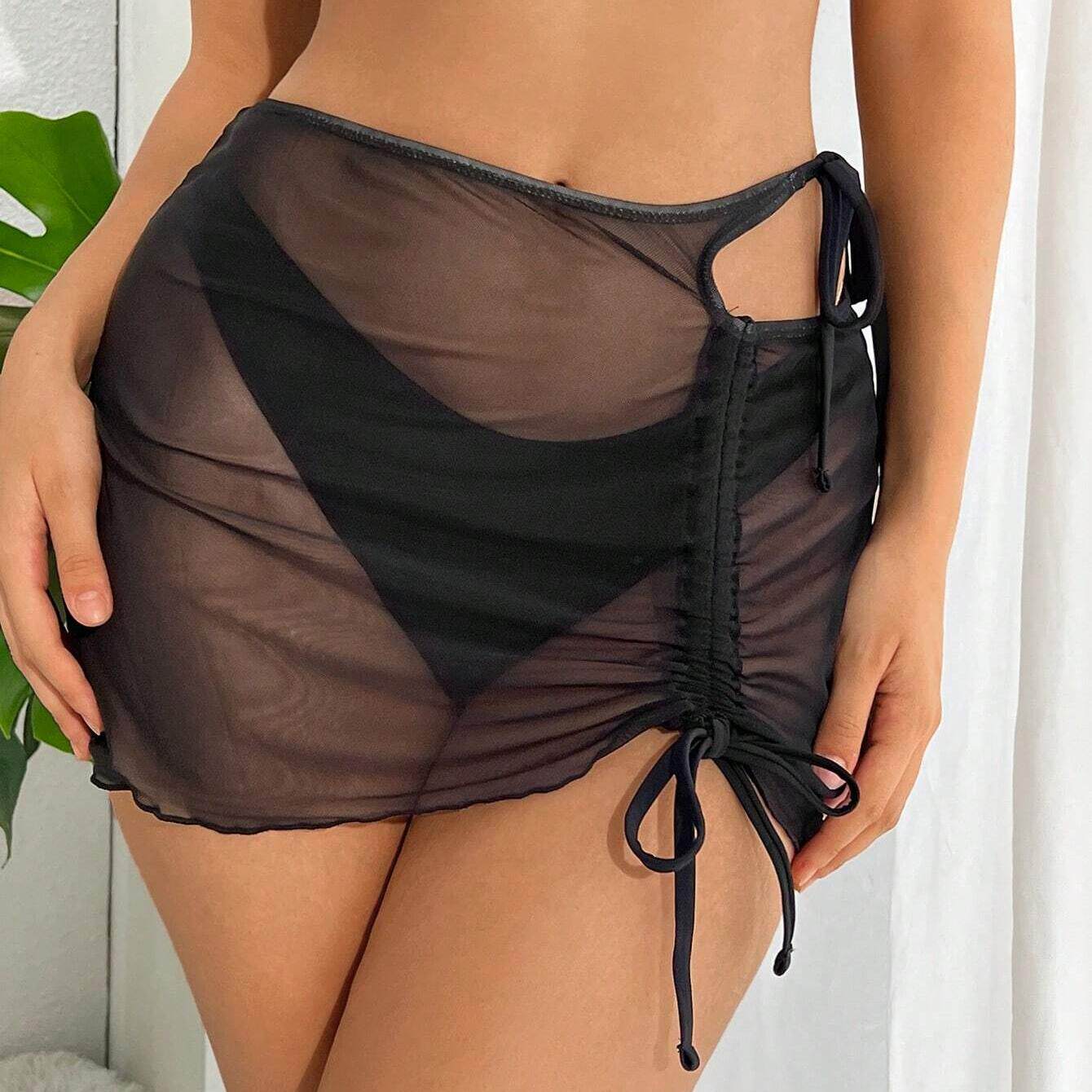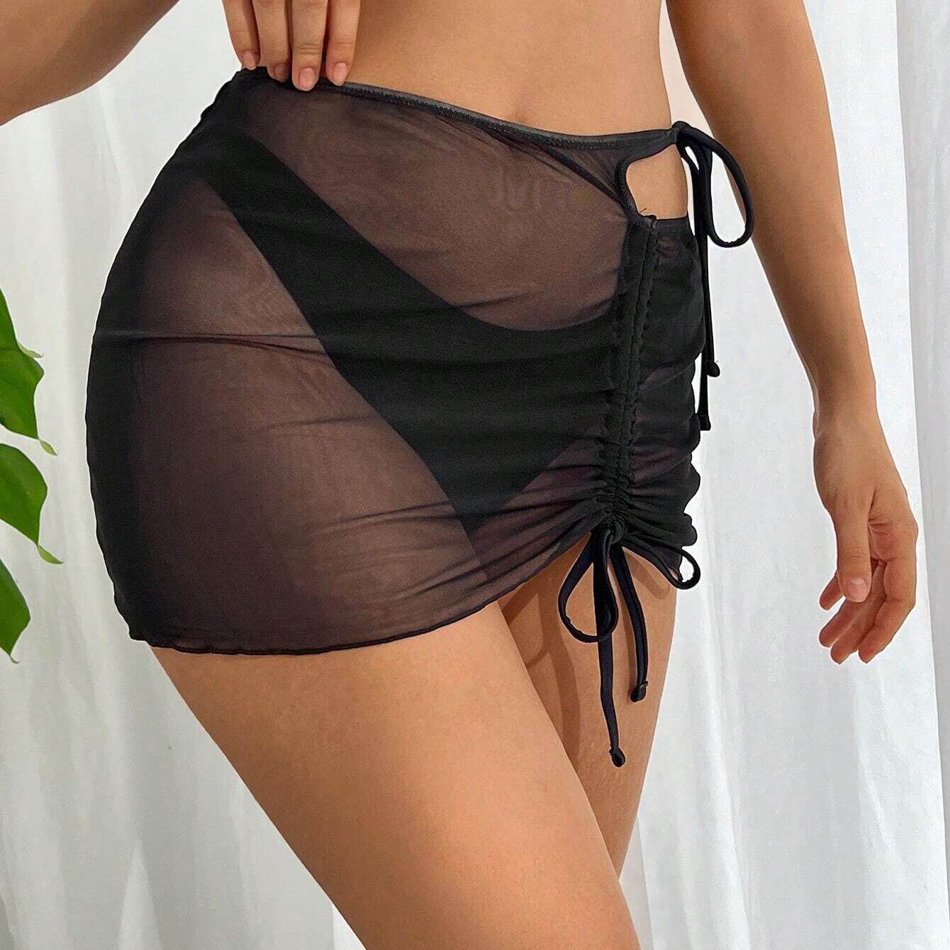 纯色网纱抽绳半身裙女性感透视欧美包臀短裙外穿沙滩裙比基尼百搭