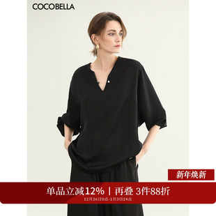 COCOBELLA奢感黑色缎面极简风衬衫 女夏气质OL通勤上衣SR7066