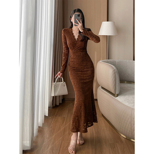 显瘦包臀鱼尾裙年会长裙 黑色V领修身 加绒加厚蕾丝连衣裙冬装 新款