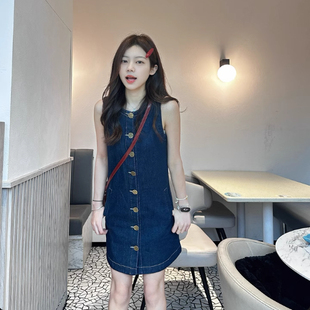 新款 韩版 牛仔背心连衣裙女2025夏季 无袖 港味单排扣小香风短裙 时尚