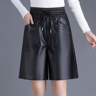 • 宽松直筒显瘦pu皮裤 黑色皮短裤 五分裤 高腰a字阔腿裤 子 女秋冬皮裤