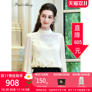 粉红玛琍小衫 桑蚕丝立领领口蕾丝上衣PMANW1017 女士秋冬新款