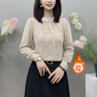 女秋冬长袖 时尚 T恤减龄百搭上衣 半高领蕾丝钉珠加绒打底衫 妈妈装