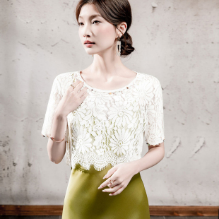优雅气质短袖 Letter 新款 moon蕾丝绸缎V领上衣2025年夏季 女 from