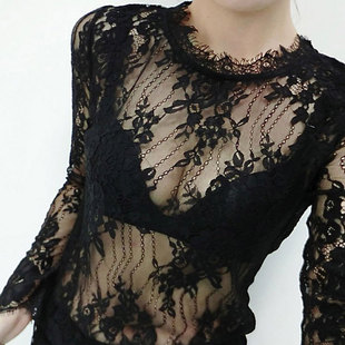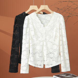2022新款 黑色蕾丝打底衫 罩衫 女长袖 性感镂空透视网纱内搭上衣 大码