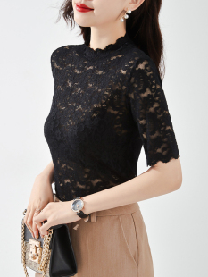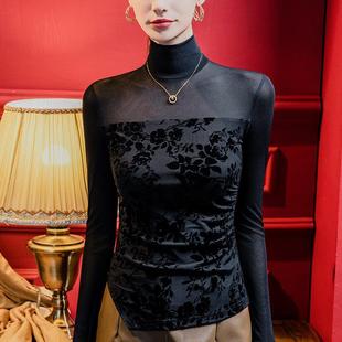 • 女2024新款 长袖 秋冬加绒内搭洋气性感蕾丝上衣 打底衫 半高领蕾丝衫