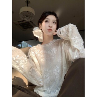 蕾丝钩花长袖 宽松套头毛衣设计感薄款 针织衫 秋季 白色上衣 女装 法式