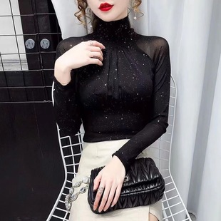 网纱t恤半透明蕾丝薄纱上衣秋装 薄款 女长袖 半高领波点印花打底衫