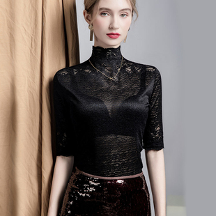 2025新款 微透打底衫 高领蕾丝上衣女中袖 镂空网纱t恤中袖 薄款 秋装